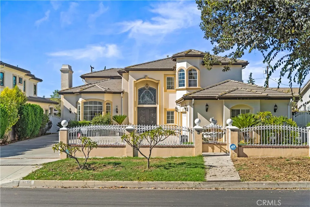 Step into elegance from the moment you enter this stunning estate. The grand foyer sets the tone with a magnificent marble medallion inlayan intricate, hand-crafted design framed by a Grecian border, gleaming beneath the soft glow of crystal chandeliers. The impressive entrance opens into a living room with soaring high ceilings, creating an airy, sun-filled space perfect for entertaining or quiet relaxation. The first floor features polished tile flooring that feels both timeless and luxurious, while warm wood flooring flows throughout the upper level for a welcoming ambiance. The graceful wrought-iron staircase is a centerpiece of craftsmanship, leading to the homes spacious upper retreat. The gourmet kitchen is complete with a large island, breakfast nook, and direct connection to the family rooman ideal setup for modern living. A first-floor bedroom suite and a dedicated office provide comfort and convenience for guests or multi-generational living. Upstairs, the expansive master suite offers resort-style luxury, complemented by a private bedroom with its own bath and two additional bedrooms sharing a well-appointed hallway bath. Outside, the generous 13,544-sq-ft lot invites endless possibilitiesfrom a future ADU to a dream garden or outdoor lounge. A private gated entry with motorized access ensures both privacy and ease, while the front yard provides ample parking, including a three-car garage and space for RV or boat storage. Conveniently located near shopping, dining, and top-rated schools, this residence perfectly combines elegance, functionality, and opportunitya