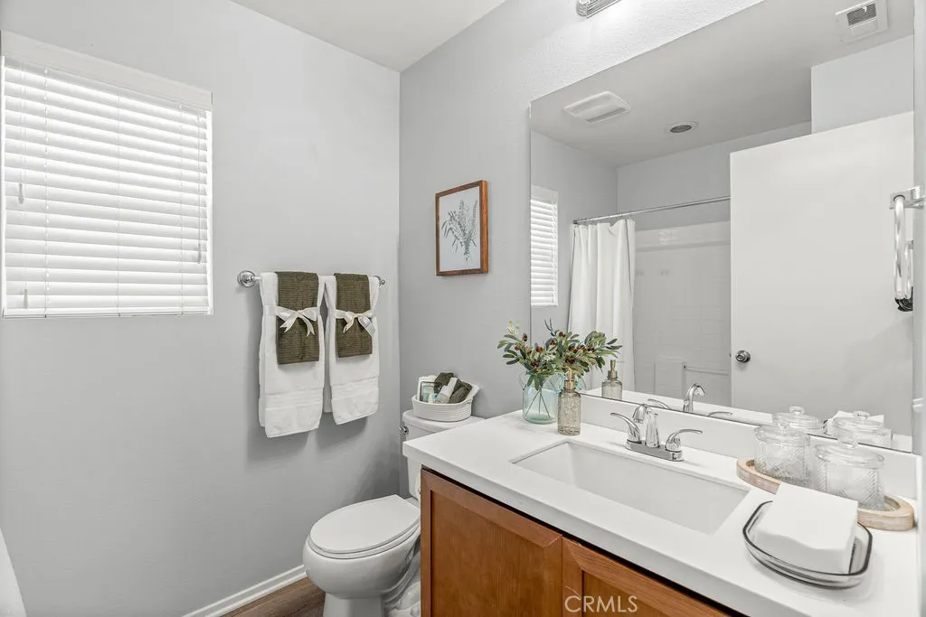 Nestled in the vibrant Canyon Hills neighborhood - presenting 34169 Carissa Dr, a beautifully maintained 3 bedroom, PLUS a downstairs multi-purpose room w/closet, 2.5 bath residence offering a stylish well-appointed floor plan. The open-concept layout is filled with natural light and provides a welcoming atmosphere for daily living or entertaining guests. Beautiful water & scratch proof laminate wood floors have been newly installed throughout the 1st and 2nd floors creating a cohesive modern style. The bright and open kitchen features maple cabinetry, granite counters, a large center island accommodating 4+ bar seating with inset stainless steel farm sink; stainless-steel free-standing stove, microwave, built-in duo trash bins, and a separate pantry. Ideally located on the 1st floor is a multi-purpose room to use as a downstairs bedroom, home office, or family/den space. There is also a 1/2 bath located downstairs. Upstairs are 3 bedrooms. The spacious primary en-suite features dual sinks, tub, walk-in shower & a large walk-in wardrobe. Two add'l bedrooms share a full bath with tub/shower combo. All bedrooms have ceiling fans and ample window exposure. Conveniently located on the 2nd floor is the laundry room. The patio features concrete patio, tropical landscaping, and artificial turf creating a very low-maintenance yard, perfect for families seeking style and convenience. Enjoy a family-friendly setting with access to clubhouse, 3 pools, multiple playgrounds, sports fields, dog parks, walking trails, and a splash padideal for outdoor enthusiasts who appreciate active ame