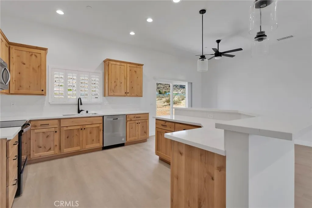 Welcome to this beautifully designed single-story home located in the city of Apple Valley. This new construction home offers a split floor plan with 4-bedrooms and 2-bathrooms. Step inside to find a bright open-concept layout with high ceilings, can lighting and upgraded flooring through-out the home. Kitchen offers quartz countertops, stainless steel appliances, sleek cabinetry and a pantry. The primary master suite offers ample space with an en-suite bathroom and a spacious closet. Outside enjoy a covered patio and beautiful views of the high desert. Home sits on over half an acre that provides plenty of space for privacy, RV access, off-road vehicles and horses. This home offers a 2-car garage, paid off solar, indoor laundry area, ceiling fans and upgraded window coverings through-out. Come see 15575 Desert Star Road!