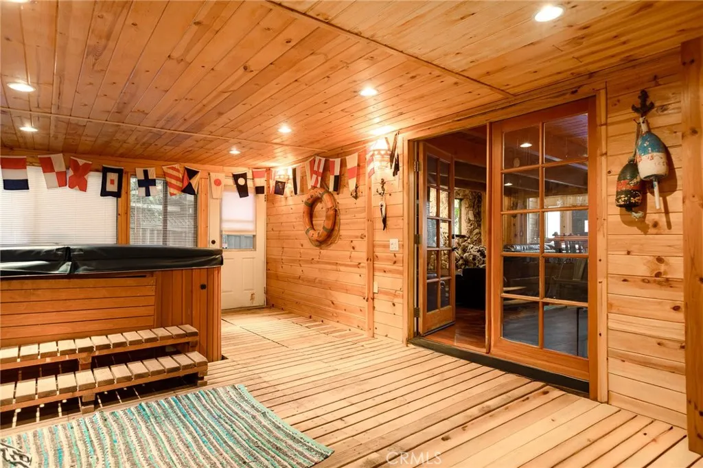 Welcome to this stunning mountain chalet nestled in one of the most popular neighborhoods in the San Bernardino Mountains. This home offers the perfect blend of mountain charm and modern comfort. Step through the front door into a grand entryway that welcomes you with warmth and style. The cozy living room features rich wood accents and large wet bar, perfect for entertaining. A separate sitting room or home office. And adorable spiral staircase leads to the upper level where you'll find two spacious bedrooms. The primary suite includes a warm, inviting fireplace, private deck and full bath-a true mountain retreat. The large kitchen with a country sink, stylish green cabinetry and plenty of space for gatherings. A separate laundry room adds convenience. For ultimate relaxation there is a jacuzzi and sauna room. Outside, enjoy the fenced backyard and attached single car garage. Easy access to ski resorts hiking trails and vibrant hub of the San Bernardino Mountains. This amazing chalet captures the essence of mountain living-warm, inviting and truly one of a kind.