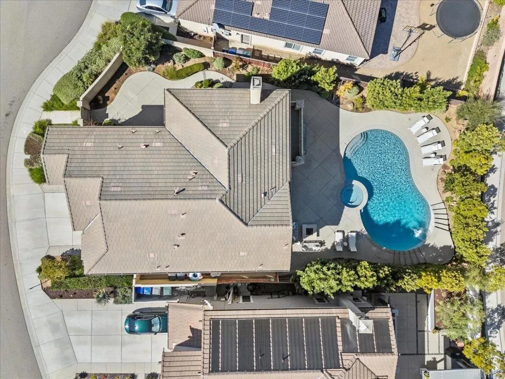 Absolute show-stopper in San Elijo Hills! Perfectly situated on a quiet cul-de-sac in the coveted Altaire community, this stunning five-bedroom, four-bath executive home offers the ideal blend of privacy, functionality, and resort-style outdoor living. The expansive 8,545 sq ft lot features a sparkling saltwater pool and spa, fire pit, and multiple lounging areas framed by mature shade and privacy treescreating a perfect balance of luxury, comfort, and a true sense of home. A gated front courtyard welcomes you into a light-filled interior with soaring ceilings, plantation shutters, and beautifully updated plank flooring. The heart of the home showcases a spacious kitchen with quartz countertops, double oven, a large island, and a walk-in pantry, opening seamlessly to the family room and backyard for effortless entertaining. Upstairs (which even offers peek-a-boo views!) features four generously sized bedrooms, each with a walk-in closet, plus a large loft ideal for a playroom, office, or media space. A downstairs bedroom and full bath provide flexible living options for guests or multi-generational families. The backyard retreat is an entertainers dream, complete with an 8-foot-deep saltwater pool, fire pit, and outdoor spaces framed by mature landscaping and fruiting plum, peach, apricot, Meyer lemon, cherry, and nectarine trees. The yard is wired for a Sonos surround sound system, creating the perfect atmosphere for outdoor gatherings. Additional highlights include a three-car garage, highly rated Double Peak K8 school, low Mello Roos, and a premier cul-de-sac location. -