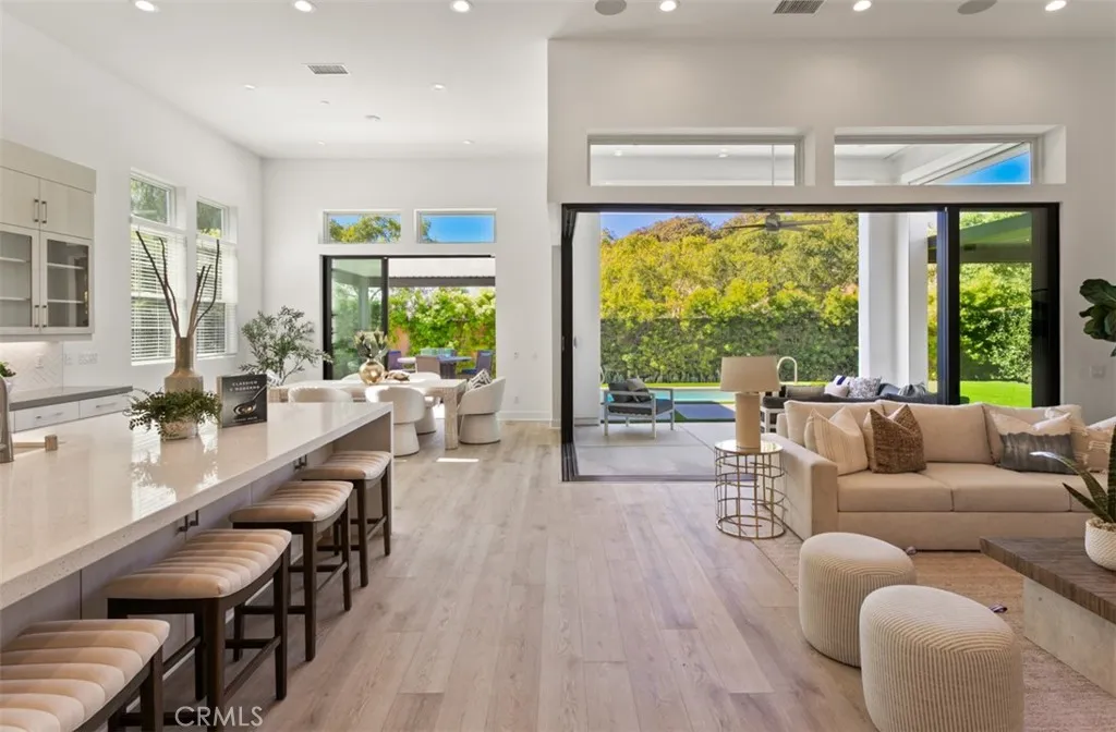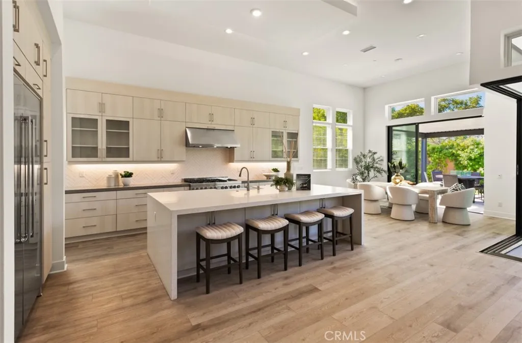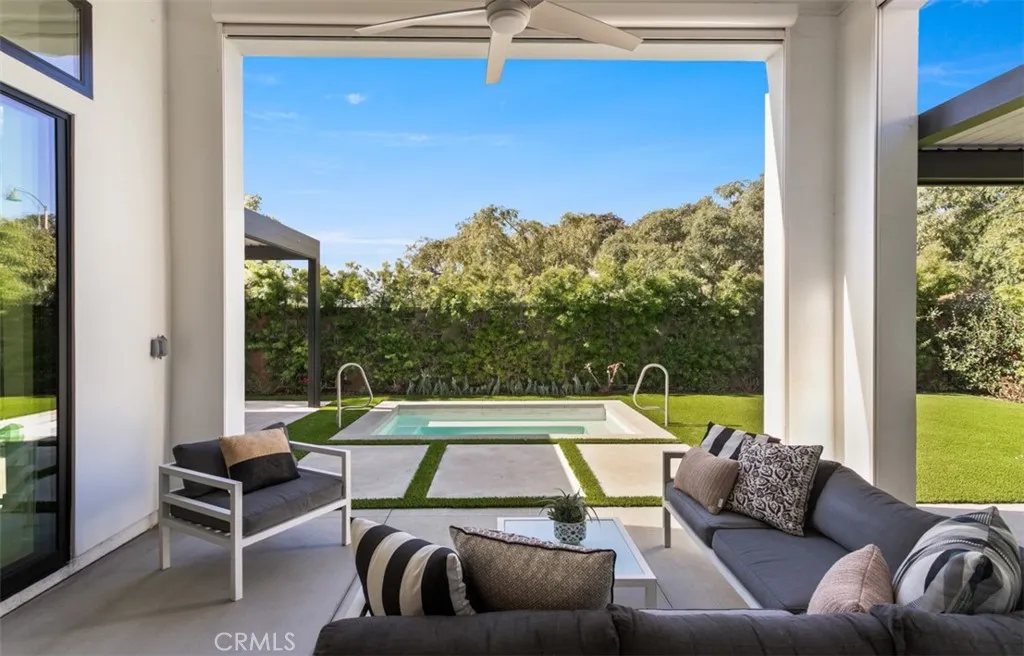 Tucked behind the gates of Pacifica San Juans coveted Ocean Hills enclave, this rare single level elevation model embodies relaxed coastal sophistication. Designed for effortless living and entertaining, the home features four bedrooms and four-and-a-half baths, each guest suite offering its own private retreat with walk-in closet and en-suite bath. The primary suite enjoys tranquil views of the backyard and includes a spa-inspired bath with a sunken tub, separate shower, dual vanities, and an expansive walk-in closet. The heart of the home centers around a light-filled great room with soaring ceilings, French Oak luxury vinyl plank flooring throughout, a sleek fireplace, and disappearing slider doors that seamlessly blend the indoors with the outdoors. The chefs kitchen impresses with a nine-foot island, high-end stainless steel appliances, large walk-in pantry, and abundant storage perfect for gatherings large or small. Hardwood flooring flows throughout, complemented by tile in the baths and a palette of warm, neutral tones that enhances the homes airy ambiance. Outside, two covered patios with an amazing display of electric awnings and shades, overlook a sparkling jetted, heated, plunge pool, creating the ideal setting for sunset dinners or lazy weekend afternoons. Every detail of this refined coastal haven celebrates the beauty of single-level luxury living in San Juan Capistrano.