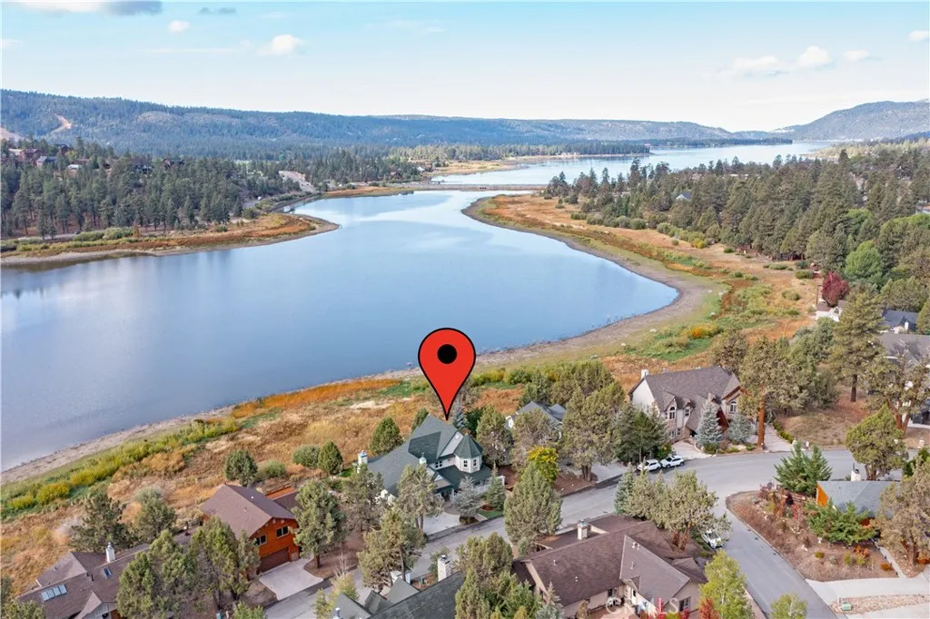 Waterfront Farmhouse Retreat with Expansive Views Located in Big bear Lake! Experience the charm of a one-of-a-kind custom Victorian home with water, forest, nature preserve, and ski slope views visible from six rooms, including the living, dining, kitchen, master suite, and two upstairs bedrooms. Nestled on Baker Pond, this property offers year-round water views. Inside, the home showcases a creative and whimsical design with handcrafted moulding, custom finishes, and thoughtful details throughout. The large master suite is a true retreat, featuring heated floors, dual walk-in closets, a freestanding clawfoot tub, and a private slider to the back deck. A custom-designed kitchen, mainfloor office/craft room with built-ins, and dining room with a built-in buffet and hutch complete the elegant living spaces. Additional highlights include hardwood floors, Milgard windows, oak staircase, curated interior dcor, and custom pantry drawers under the stairs. Outdoors, enjoy multiple areas for relaxation and entertaining: a large covered front porch, expansive back deck (partially covered and uncovered), gazebo pad, and a second-story balcony with pond and mountain views. The curated backyard with water feature adds a peaceful touch. Functional features include a three-car tandem garage with dedicated workroom, dual forced-air heating systems, steel beam construction in the turret/porch area, a large crawl space for storage, and a full-height attic. The exterior is designed for carefree living with a solid PVC deck, vinyl siding, and asphalt roof. Located in a quiet, clean neighborho