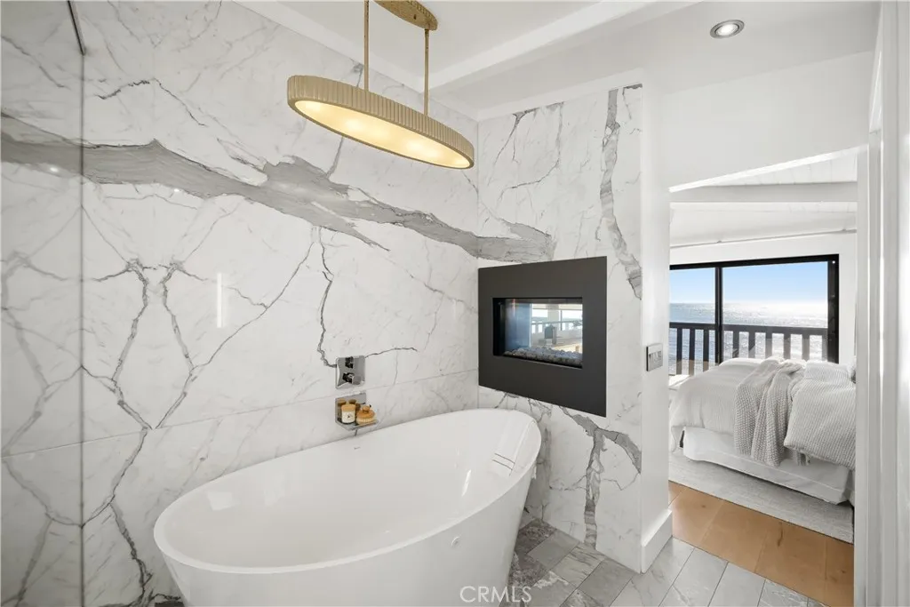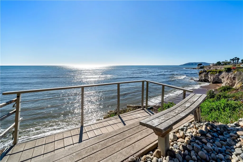 Perched dramatically above the Pacific along Shell Beachs coveted Shoreline Drive, this Contemporary Coastal retreat captures panoramic ocean views from every room. Thoughtfully redesigned with an emphasis on natural light, clean architectural lines, and seamless indoor-outdoor flow, this residence perfectly balances refined sophistication with relaxed seaside living. The open-concept main level welcomes you with vaulted beamed ceilings and wide-planked flooring that carries throughout the space. Walls of glass frame endless blue horizons and open to a glass-enclosed deck designed for entertaining, dining al fresco, or simply soaking in breathtaking sunsets over the Pacific. The great room centers around a sleek linear fireplace and flows effortlessly into the dining area and gourmet kitchen, where custom cabinetry, a sea-glass mosaic backsplash, and dramatic natural stone countertops reflect the oceans hues. Stainless steel appliances, modern lighting, and a stylish breakfast bar complete this elevated culinary space. Upstairs, the primary suite offers a serene private escape with vaulted tongue-and-groove ceilings, a contemporary see-thru fireplace, and sliding glass doors leading to a private balcony overlooking the coastline. The spa-inspired ensuite bath features radiant floor heating, marble and glass finishes, dual vanities, and a large walk-in shower that evokes a luxurious retreat. A custom dressing area with built-ins and mirrored cabinetry provides abundant storage and elegance. Two additional bedrooms on the lower level open directly to the backyard, each featur
