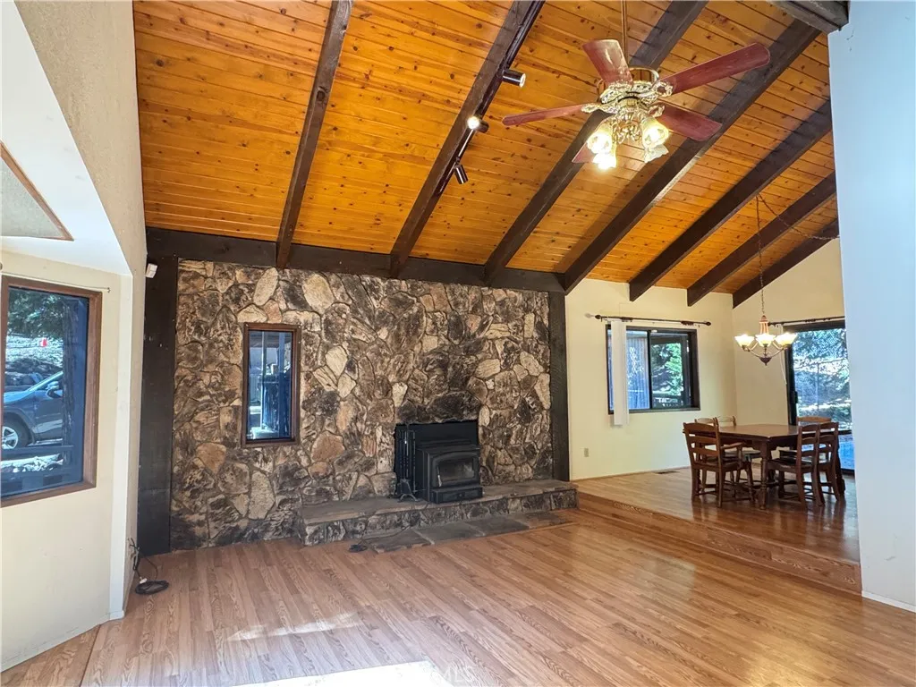 Welcome to this charming mountain retreat nestled in the Lower Rowco neighborhood of Running Springs. This home features 3 bedrooms and 3 bathrooms with an open floorplan perfect for comfortable living and entertaining. Enjoy cozy mountain evenings by the stone wall wood-burning stove and stay cool all summer with the split-unit air conditioning. The spacious layout offers plenty of natural light and a seamless flow between the living, dining, and kitchen areas, ideal for relaxing or hosting family and friends. Enjoy this flat useable lot with tons of parking and storage. Perfectly located in a wonderful neighborhood with easy year-round access. This home offers the perfect blend of peaceful mountain living and modern convenience. Your mountain lifestyle awaits, and so close to Snow Valley Ski Resort plus SkyPark at Santa's Village!