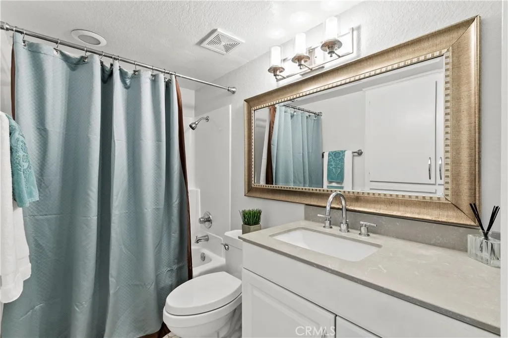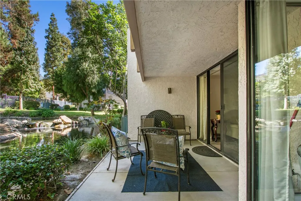 Enjoy the serenity of nature right outside your door in this inviting Quail Creek condo. The first-floor location offers a scenic patio overlooking the water. Step out to the patio and take in the soothing sound of the creek, a natural backdrop for reading, dining, or simply relaxing. Inside, luxury vinyl plank floors and fresh paint complement the open layout, where the living room with a fireplace, dining area, and kitchen flow seamlessly together. The modern kitchen features white cabinetry, stainless steel appliances, a subway tile backsplash, striking black granite countertops, and a small kitchen peninsula perfect for bar stools. There are two generously sized bedrooms, including the primary suite with a walk-in shower plus sliders to the patio. Additional features include a new HVAC system, updated bathrooms, and a roof replacement completed in April 2025. Quail Creek is known for its tranquil environment, complete with walking paths, 2 community pools and spas, sauna, tennis courts, dog park, and convenient access to nearby shopping, dining, and freeways.