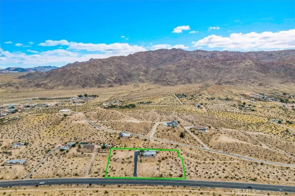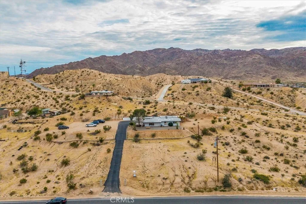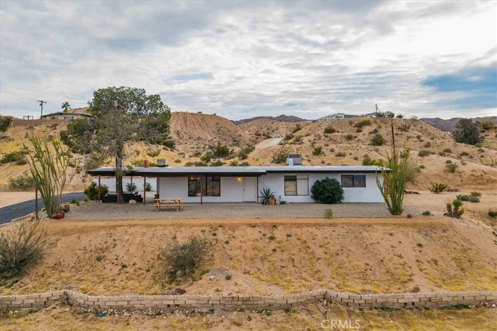 This place has an amazing story and many cool aspects. There is a main house and a back house, (two adjoining lots sold separately but could be purchased together)included with this sale. The main house has 3 bedrooms and 2 bath with brick fireplace, central heat and AC (dated) with additional Evap cooler, separate indoor laundry and mud room exit/entrance, massive windows with views for days, expansive carport and oversized covered patio, mature trees and landscape throughout the property. There is new asphalt leading up to the property and several hundred square feet of concrete outside for more curb appeal and less dirt and sand indoors. Solar panels have been installed and are saving the homeowner money each month and is on a lease, that will need to be transferred or negotiated in the purchase and paid off at closing. The detached 1 bedroom unit has been fully remodeled with a full kitchen, heating, mini split, dining and living space with a separate bedroom that can fit a King bed with a 3/4 bathroom. It's a wonderful add to an already existing 3/2 house next to it. Very private and tremendous views from almost any window or door. It sits atop a hill that has many unobstructed views of the mountains, valleys, homes, sunsets and sunrises! Truly one of the best properties at this price in 29 Palms! If that was not enough, two additional parcels one on each side of the property can also be purchased. You can build your dream homes or add ADU's and garages depending on your vision and approval through the City. There is Soooo much potential!!!!! (other two lots - APN: 061