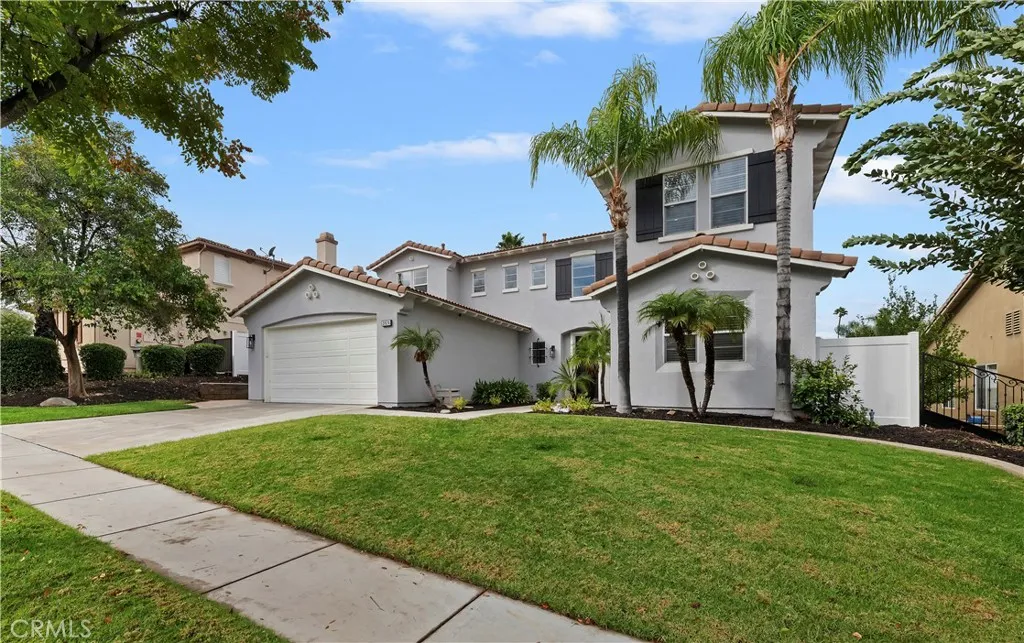 Nestled in the scenic green foothills of Corona, this stunning turnkey home blends modern upgrades with timeless comfort. The freshly painted exterior and manicured landscaping create an inviting first impression, leading into an elegant interior filled with natural light and refined design. Inside, soaring ceilings, new engineered hardwood floors, and a recently refreshed banister set the tone for the open and spacious layout. The living and dining areas flow seamlessly into the family room and a beautifully renovated kitchen featuring crisp white cabinetry, a large center island with quartz countertops, subway tile backsplash, and new KitchenAid appliancescomplemented by a premium Thermador stove. Two large bedrooms are conveniently located on the main floor, one offering its own private entranceperfect for guests, extended family, or a home office. Upstairs, the primary suite serves as a peaceful retreat with a cozy fireplace, sitting area, and a spa-like bathroom. Each of the homes three bathrooms has been updated with new toilets, while all bedrooms feature new carpet for a soft, fresh feel. There is also a large bonus room upstairs that currently being used as a theater room. Additional upgrades include a new dual-zone HVAC system, a tankless water heater, and new baseboards throughout. Step outside to your private resort-style backyard, where a sparkling Pebble Tec pool and spa create the perfect space for entertaining or relaxing. The pool area has been enhanced with new equipment, updated lighting, and a freshly painted slide, all surrounded by lush tropical landsc