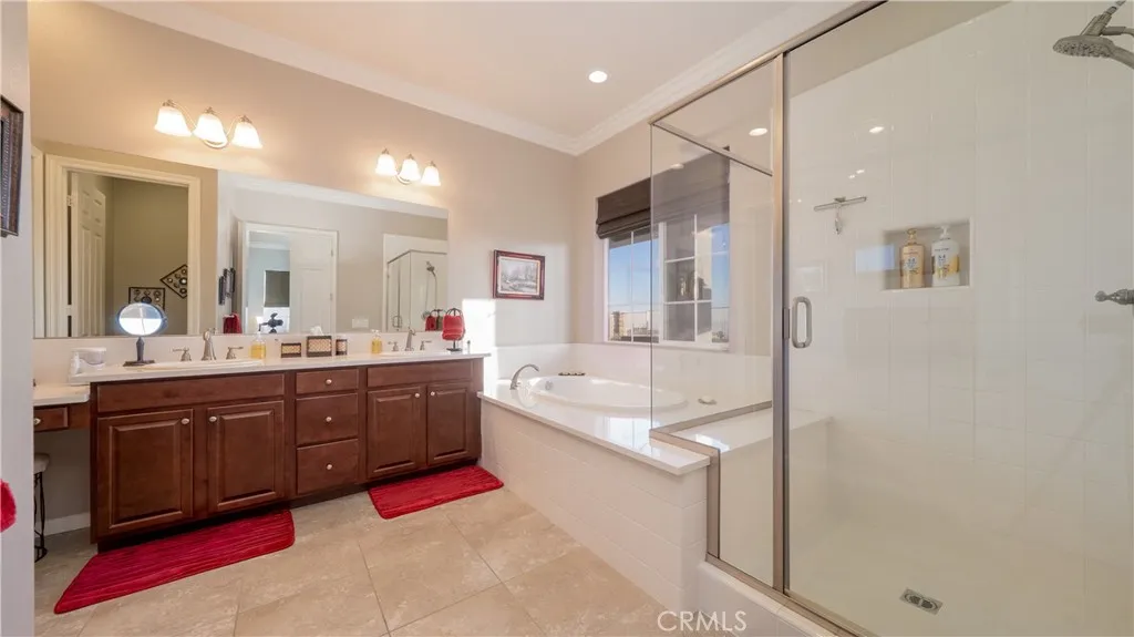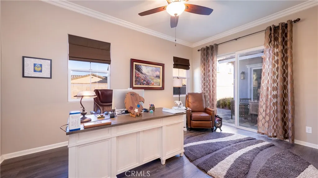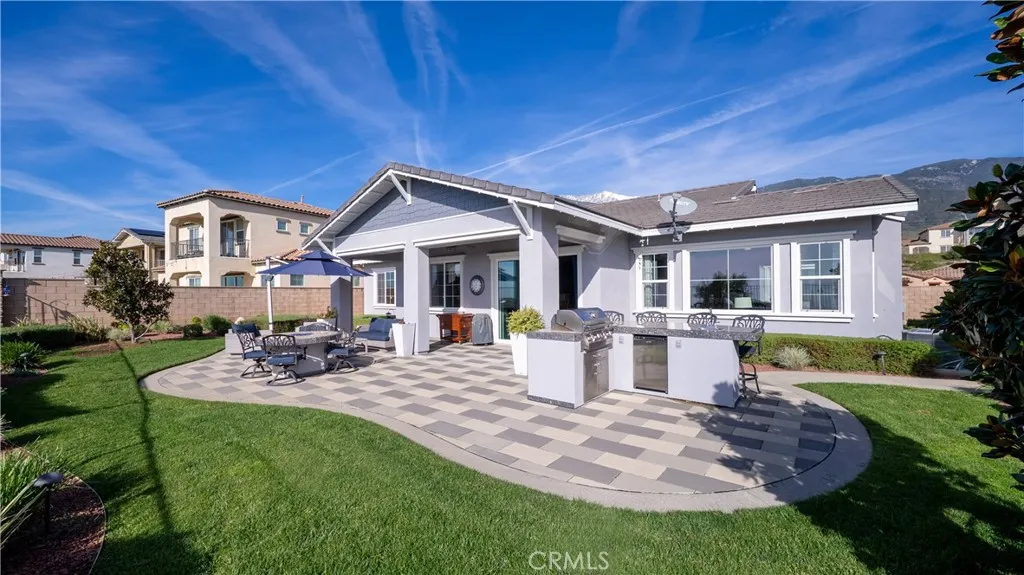 Rancho Etiwanda Estates Single Story with Spectacular City Light & Mountain Views. This beautiful single-story home sits in Rancho Etiwanda Estates and delivers rare panoramic city light and mountain views. The curb appeal is impressive, featuring custom professional landscaping, hardscape lighting in front and back, LED lighting wrapped around the exterior, and fresh paint inside and out. A large, inviting front porch captures a perfect mountain view, & the Ring doorbell adds convenience and security. Inside, the home offers 3 bedrooms plus a dedicated office. Crown molding runs throughout. High-quality Pergo flooring adds warmth, & every bedroom features a ceiling fan with lighting. Each bedroom features an en-suite bathroom with a custom walk-in shower, detailed tile work, linear drains, & frameless glass doors. All closets feature upgraded organizers. The primary bath features a separate walk-in shower and oversized soaking tub, dual vanities, a makeup station, and a large walk-in closet with custom shelving and shoe racks. The office is a peaceful retreat with a ceiling fan and direct access to the serene center courtyard. A large formal dining room with a centerpiece chandelier sets the stage for gatherings. The family room includes a cozy fireplace with a mantle, an oversized ceiling fan, a media niche, and another access point to the courtyard. Natural light fills this home, keeping it bright and welcoming throughout the day. The kitchen opens to the family room and includes a breakfast nook with a panorama door that expands the indoor-outdoor experience. The kitche
