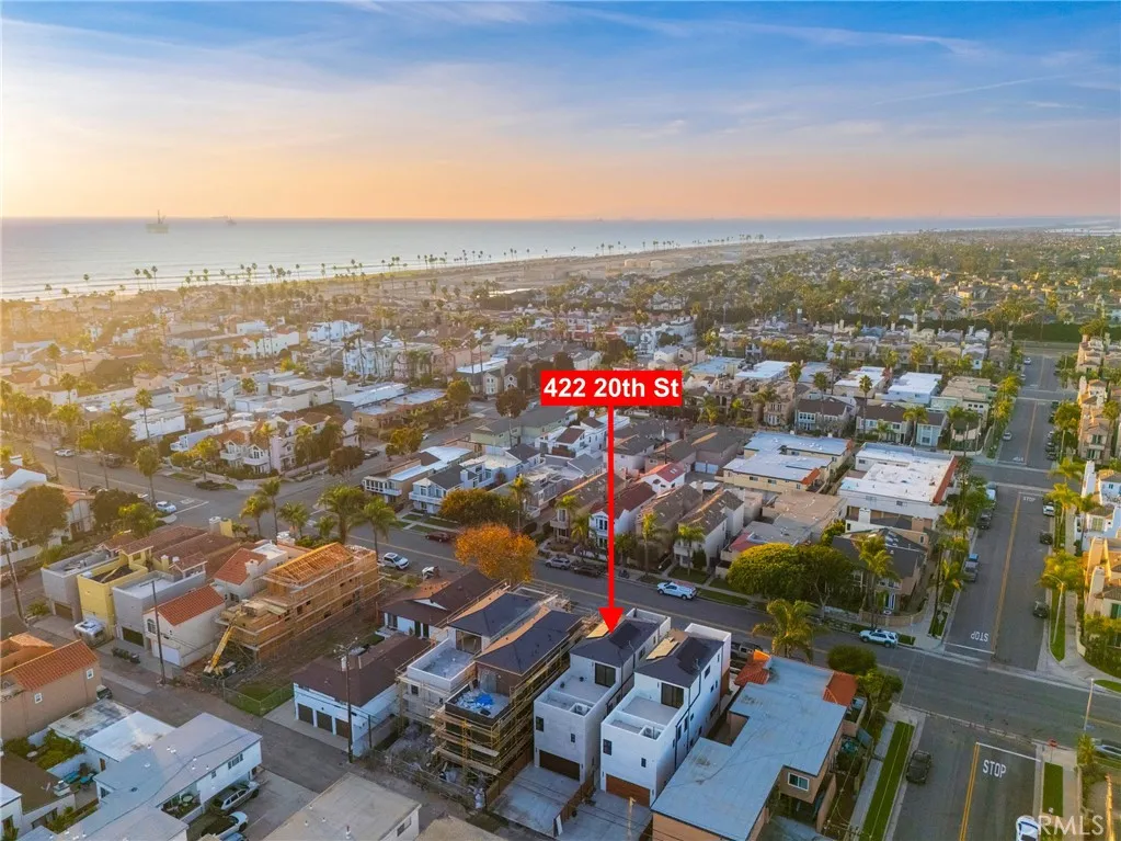 Welcome to 422 20th Street, a newly built coastal contemporary home in the heart of Huntington Beach, just four blocks from the ocean and minutes from Main Street, Pacific City, and the iconic pier. Designed for luxury and convenience, this three-story residence offers 3 bedrooms, 4.5 baths, and an oversized elevator connecting every level. The open floor plan seamlessly integrates the living room with its floor-to-ceiling marble fireplace, the private front patio accessed through sliding glass doors, the dining area, and a chefs kitchen featuring a large quartzite island with seating for four, Thermador stainless steel appliances including built-in refrigerator, dual ovens, six-burner range with griddle, two dishwashers, and a walk-in pantry. Take the elevator or ascend the glass-paneled staircase to your private retreat on the second level, highlighted by a primary suite with a floor-to-ceiling marble fireplace, private balcony, custom-organized walk-in closet, and a spa-inspired bath with soaking tub, glass-enclosed shower, marble-accented walls, dual vanities with double sinks, and gold-finished fixtures throughout. Completing this level are two additional bedrooms with ensuite baths and a laundry room equipped with new washer and dryer. The third level offers a spacious bonus room with full bath, mini kitchenette, and wine refrigerator, opening to two separate sundecks for ocean breezes and sunset views. Additional highlights include a two-car tiled garage with room for up to three more cars in the extended driveway, Tesla solar and battery charging station, automatic