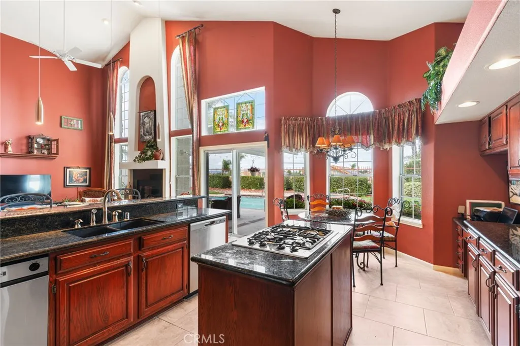 Beautifully maintained home offering spacious living areas, refined architectural details, and a true resort-style backyard. The main level features multiple living and dining spaces, high ceilings, archways, and abundant natural light. The well-appointed kitchen includes rich wood cabinetry, granite countertops, stainless steel appliances, double ovens, a gas cooktop, large prep island, and an extended breakfast bar that opens to the family room with fireplace. Upstairs youll find generously sized bedrooms, including a large primary suite with a soaking tub, walk-in shower, dual sinks, and an expansive vanity area. Additional bedrooms offer comfortable layouts and plenty of natural light. The home also features a spacious laundry room and well-designed storage throughout. The backyard is an entertainers dream with a sparkling pool, elevated spa, mature landscaping, covered patio, and multiple seating areas for outdoor dining and relaxation. This property offers excellent indoor-outdoor flow and is ideal for gatherings or quiet evenings at home. A wonderful opportunity to own a beautifully cared-for residence with standout curb appeal, quality finishes, and an inviting atmosphere in every room.