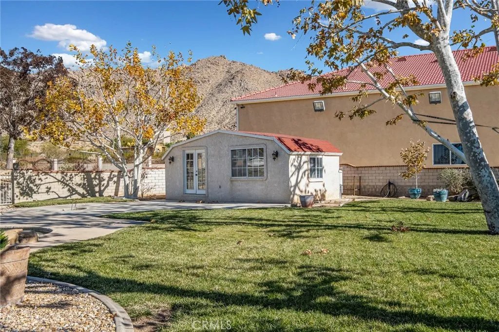 Introducing a rare opportunity in the prestigious Sycamore Rocks neighborhood of Apple Valley: A breathtaking 2.38-acre corner-lot estate with sweeping valley views and a dramatic rocky mountain backdrop. This residence offers 3,658 sq ft of refined living, enhanced by a spacious bonus room, an impressive office with built-ins and private patio, and abundant natural light from multiple large skylights. Designed for both elegance and comfort, the home features a gourmet kitchen with a large island and custom built-ins, an inviting family room with a woodstove insert, brick hearth, custom built-ins and a formal dining room with a coffered ceiling. The primary suite is a true retreat with a fireplace and a spa-inspired bath offering a soaking tub, step-in shower, private water closet, dual vanities, and two wardrobe rooms. A large laundry/utility room with extensive cabinetry and an attached 3-car garage complete the main home. Step outside to resort-style living with a sparkling pool and spa, waterfall, pool house, fire pit gathering area, and an expansive covered back patio with an outdoor kitchen/entertaining areaperfect for sunset evenings under the High Desert sky. Utility features are equally impressive, including two fully owned solar systems (home + pool/spa), plus the rare advantage of both a private well and utility water for efficiency and independence. The propertys signature differentiator is the approximately 4,000 sq ft dream shopa standout feature rarely found, offering four roll-up doors, its own bath, laundry/utility room, abundant storage, and a private stud