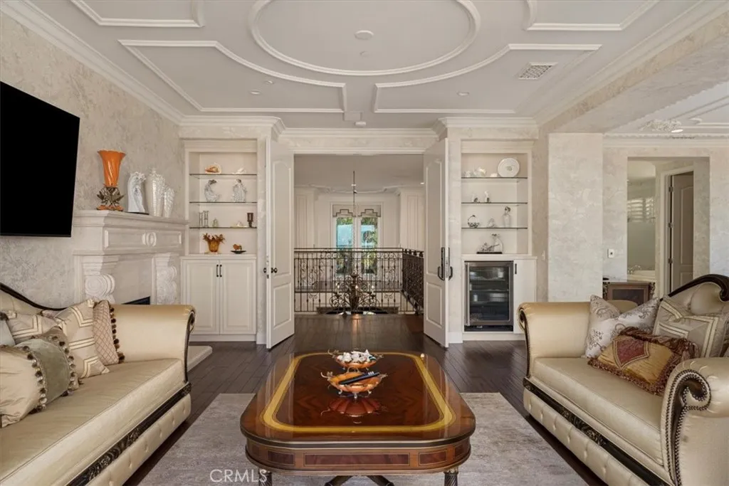 On a tranquil cul-de-sac in the exclusive, guard-gated community of Pelican Hill in Newport Coast, California, a 6,200-square-foot estate sits on a scenic quarter-acre lot. Its freshly painted exterior, towering palm trees, and manicured landscaping set the stage for this 6-bedroom, 6.5-bath Spanish-style residence. Panoramic views of the Pacific Ocean and spectacular sunsets are visible from many vantage points. Glass-inlaid double doors open to a grand foyer, where soaring ceilings, exquisite and artful design create a refined ambiance. Handcrafted Spanish natural stone fireplaces anchor key entertaining areas. The main level features formal living and dining areas that capture coastal views. An inviting family room leads to a sun-drenched breakfast nook and an exceptional chef-inspired kitchen. Equipped with premium Viking/JennAir appliances and oversized Spanish natural stone island. Downstairs provides a guest ensuite and powder room, while upstairs features four comfortable and stylish retreats, along with an office adorned with bookcases and a custom double-sided desk that can easily be converted back into a fifth bedroom. The primary suite featuring a personal sitting area with a fireplace, an ocean-view terrace, Spanish natural marble double vanities, a bathing tub, shower, and a smart toilet. Carefully selected high-end curtains and wallpaper imported from England, as well as luxurious carpets. The junior suite shares the same design philosophy, but with different decorations. Its ensuite also features a double vanity, a brand-new tub and shower. From its British-