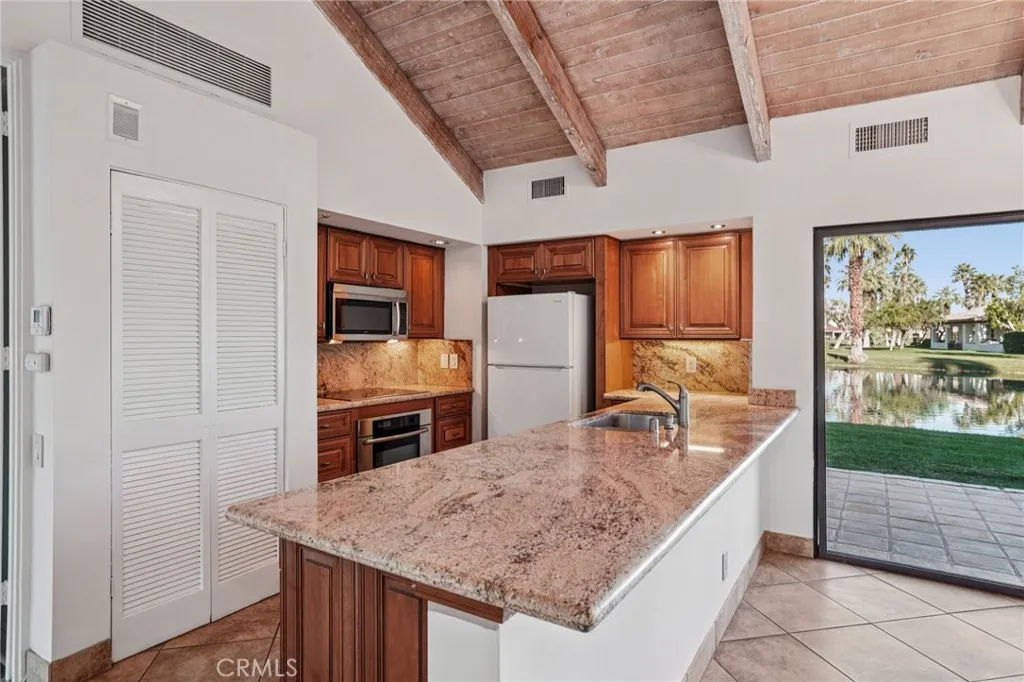 Welcome to 380 Wimbledon Drive a beautiful 1 bedroom, 1.5 bath single level retreat perfectly situated along the lakefront in the heart of the prestigious Mission Hills Country Club. This 1,049 sq ft home exudes resort style sophistication with soaring wood beamed ceilings and an open concept layout that flows effortlessly onto multiple private patios, where walls of glass invite natural light and frame panoramic views of the serene lake and surrounding mountains. Inside, enjoy sun drenched great room with panoramic views from every direction and anchored by a cozy fireplace and a designer kitchen featuring stone countertops, and premium stainless steel appliances perfect for entertaining or unwinding in style. The spacious primary suite provides a peaceful escape with vaulted ceilings and tranquil lake views just steps from your bed. Beyond the home, Mission Hills Country Club is truly a golfers dream and an active lifestyle haven, boasting 54 holes of championship golf, the No. 1 USTA tennis facility in the nation, world class pickleball and croquet courts, plus a state of the art fitness center, resort pools, rejuvenating spa services, and vibrant dining and social venues. Whether youre seeking a full time residence, vacation retreat, or investment property, 380 Wimbledon Drive offers the perfect blend of comfort, elegance, and resort living in one of Rancho Mirages highly sought after communities.