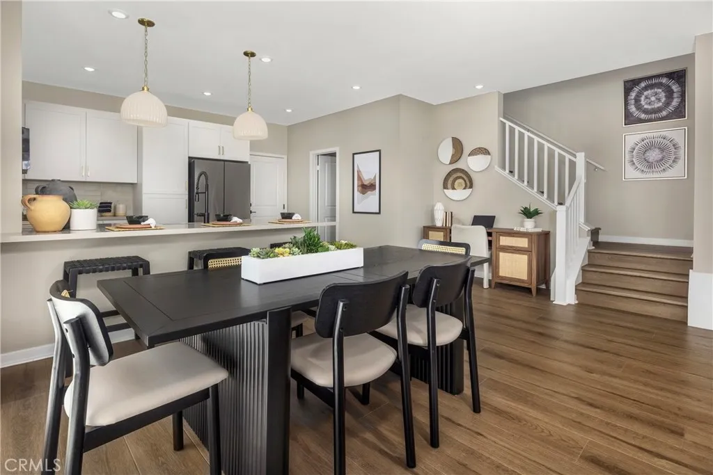 New construction home by Risewell Homes at Eave in Ontario. Desirable, end/corner location for this two-level townhome that's walkable to dog park, parks, trails, pool and lounge. Curb appeal aplenty with modern architecture, front patio + side courtyard, large windows top to bottom allowing for tons of natural light. Once inside find designer-curated finishes at Great Room/Dining/Kitchen, including LVP floors, Quartz counters, white flat panel cabinetry w/ bronze hardware, electrical options. Second level offers a large Primary Suite opposite secondary Beds/Bath and Laundry closet. Sleek Samsung appliance package, with washer/dryer/fridge, also included. The resort-style pool and lounge area (see photos) highlight this contemporary neighborhood that's hidden away from main thoroughfares yet so close to New Haven Marketplace, I-15, 91 and 60 travel corridors, The Station at Eastvale, and a variety of other shopping/dining/entertainment options. Seller concessions available. Construction underway, estimated April Move In.