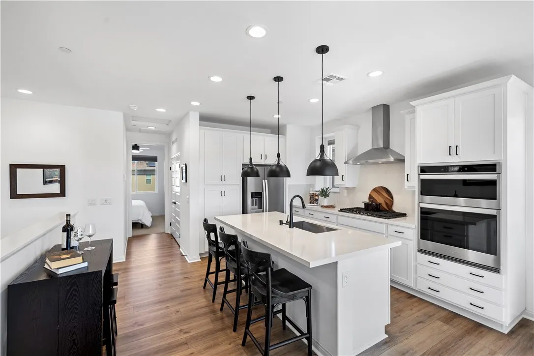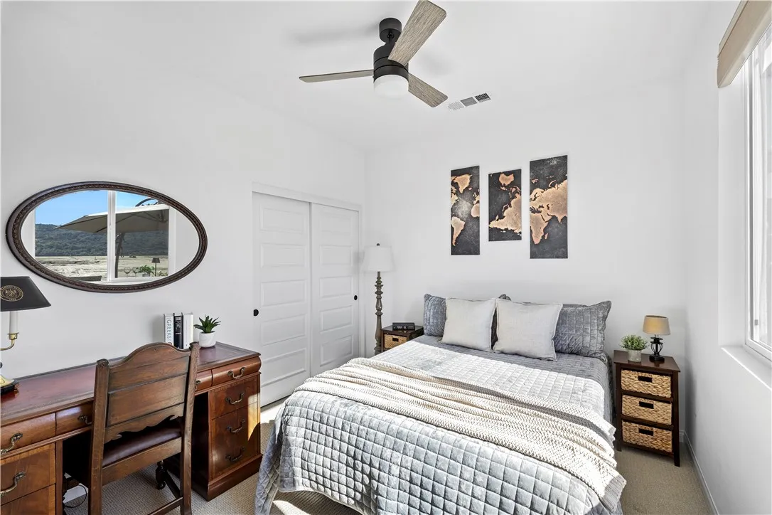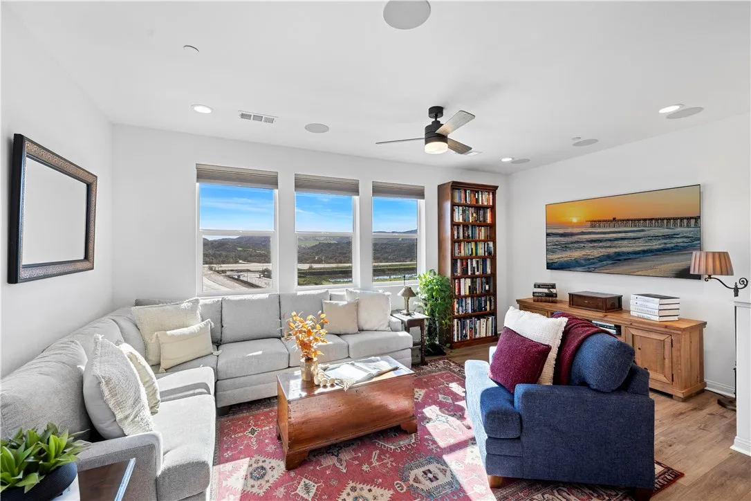 Nestled on a premium lot with sweeping views of ranch land, green hills, and surrounding mountains, this home offers a rare combination of privacy, nature, and open-sky beauty that welcomes every lifestyle. From sunrise to sunset, coastal breezes and ever-changing hillside views create a peaceful, elevated setting that feels both expansive and serene. The rare, true backyard is a private outdoor retreat designed to showcase the breathtaking landscape. With recessed fencing for infinity-style views, the professionally landscaped space includes pavers, low-maintenance greenery, ambient lighting, and an oversized natural gas fire feature, creating the perfect setting for sunsets by the fire and relaxed evenings under open skies. Its an outdoor space that feels like a natural extension of the home and a front-row seat to the rolling terrain on The Ranch. At the heart of the home, the kitchen pairs refined finishes with everyday functionality, featuring a large island with bar seating, quartz countertops, a slab quartz backsplash, and extensive cabinetry. Overlooking the living and dining spaces, its a natural hub for casual meals, gatherings, and connection. Large windows frame the surrounding hills, while custom cellular shades throughout provide comfort without sacrificing light. The living room is enhanced by a surround sound package, making it ideal for both movie nights and entertaining. The thoughtfully designed two-bedroom layout offers an upstairs primary suite and a downstairs secondary bedroom, ideal for guests, multigenerational living, or a home office. The primary