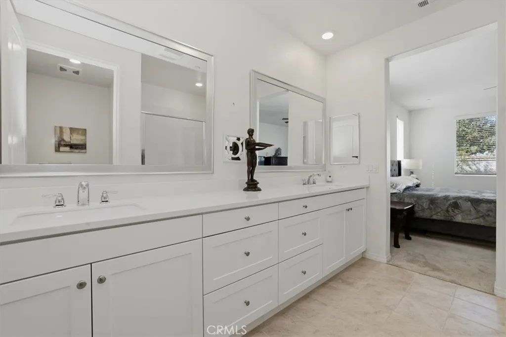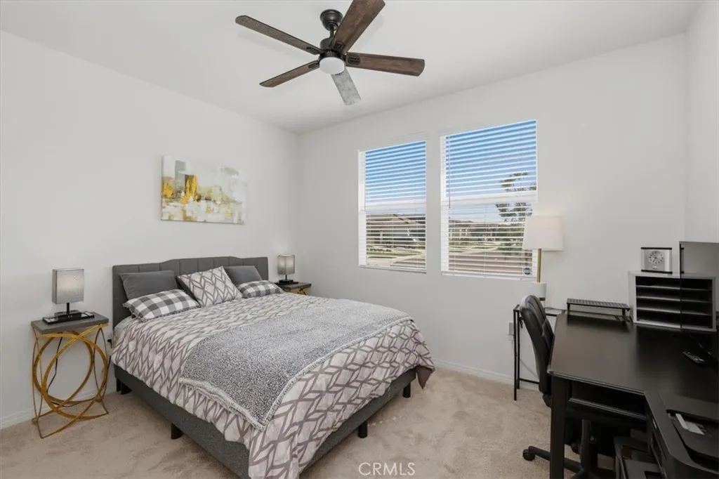 Experience the best of active-adult living in this beautifully upgraded single-story home in the gated 55+ community of Esperanza at Ontario Ranch. Thoughtfully designed for comfort and ease, this home features open-concept living, a private low-maintenance backyard, and resort-style amenities just moments from your door. Offering 1,556 sq. ft., this 2-bedroom, 2-bath residence blends modern comfort with a functional layout ideal for everyday living and entertaining. The open-concept great room seamlessly connects the kitchen, dining, and living areascreating an inviting space to gather or relax. The kitchen is appointed with matching stainless steel GE appliances, including a double oven, 5-burner cooktop with hood, microwave, dishwasher, and refrigerator, along with granite countertops, a center island with breakfast bar, and a walk-in pantry. Interior features include tile flooring in main living areas, carpeted bedrooms, 9-foot ceilings, recessed lighting, ceiling fans, ample storage, a dedicated laundry room, tankless water heater, and built-in fire sprinkler system. The primary suite offers a peaceful retreat with a large walk-in closet and an ensuite bath featuring dual vanities, walk-in shower, and private water closet. A secondary bedroom and full bath provide ideal space for guests or a home office. Enjoy indoor-outdoor living with dual sliding glass doors leading to a covered patio and private backyard, finished with synthetic turf, river rock, drought-tolerant landscaping, and block wall privacy. Security screen doors with 3-point locking systems add comfort and