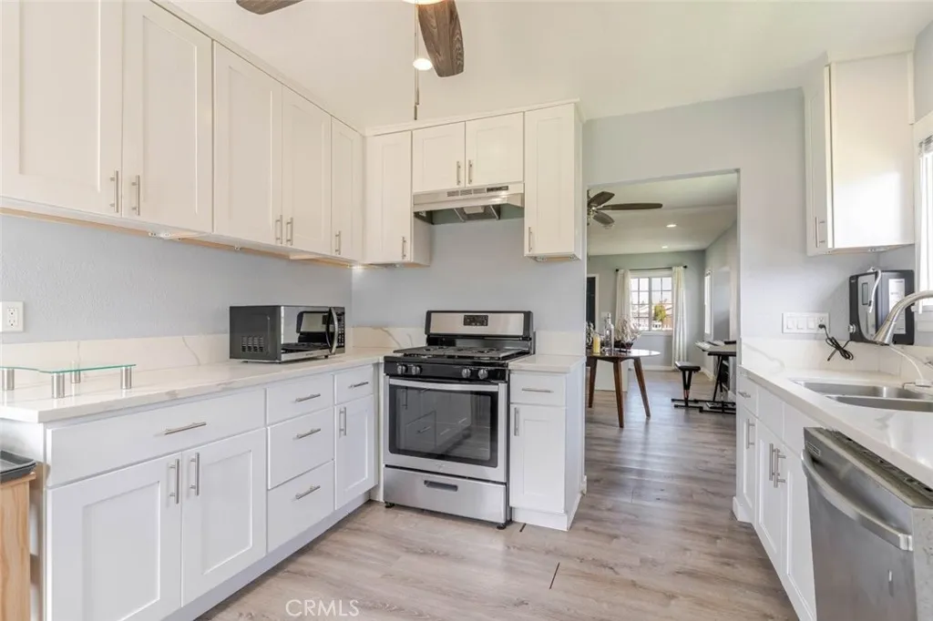 Charming 1920, 2-bed, 1-bath home in Los Angeles, Metropolitan Southwest! Behind an electric gate (controlled with an app), you are greeted with a large front lawn, long parking area, and cozy front patio. Enter the 907 sqft home into a bright and open living space showcasing new paint and flooring throughout, recessed lighting, ceiling fan/light fixture, and plenty of room for lounging, dining, and entertaining. Carry on into the recently remodeled kitchen equipped with beautiful countertops, great cabinet space, stainless-steel appliances, a double-basin sink, and hallway with stackable washer/dryer hookups and storage. Both bedrooms offer good-sized closets and ceiling fan/light fixtures, while the primary has direct access to the backyard deck. On a 8,969 sqft lot, the backyard is huge! Relax on the deck or patio, and enjoy the large lawn space. The 2-car detached garage offers additional storage space and as an attached pergola patio. Additional features include new plumbing in the entire house, and the whole house has been rewired. Located close to markets, parks, shopping, and freeway access.