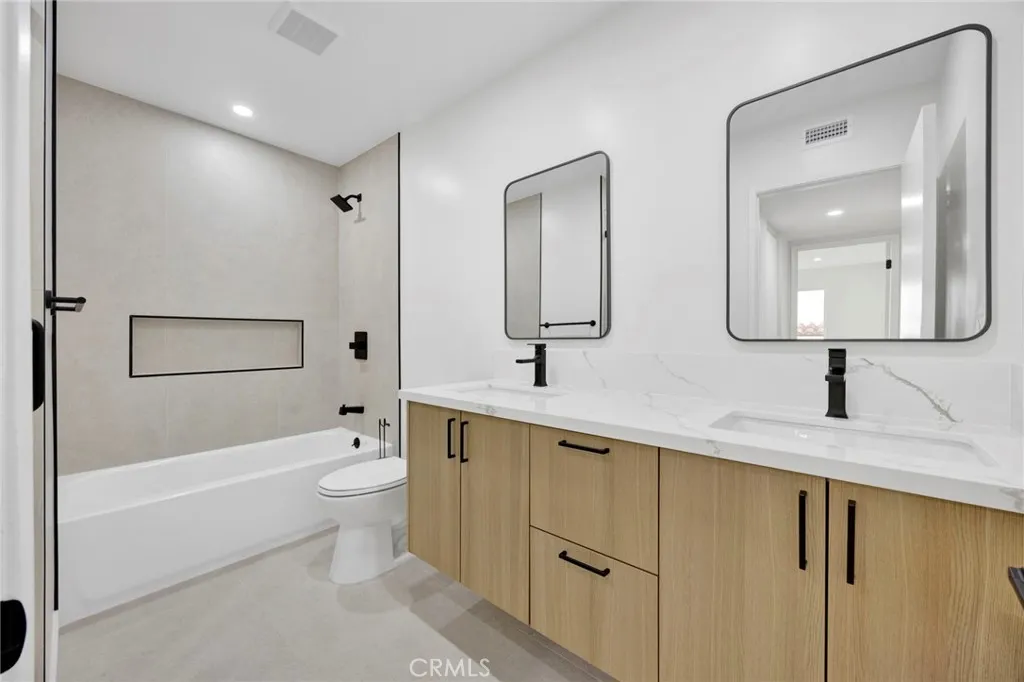 Back on Market!!! Welcome to this beautifully remodeled, move-in-ready modern townhome located in the heart of Granada Hills. Meticulously upgraded from top to bottom, this home offers a stylish and functional layout featuring a top-floor bonus room/loft and a cozy fireplace accented with contemporary tile. The interior showcases brand-new flooring, new energy-efficient windows, new sliding patio door leading to a private balcony, recessed lighting, and sleek matte-black stair railings that create a clean, modern aesthetic throughout. The brand-new kitchen is a true showstopper, featuring Calacatta Nova Quartz countertops with a full-height matching backsplash, crisp white shaker cabinetry, stainless steel appliances, and striking matte-black finishes that add a sophisticated tough. The bathrooms have been fully redesigned with white oaktone cabinetry, designer European tile, a spacious soaking tub, and a custom glass-enclosed shower creating a spa-like experience at home. Additional highlights include a brand new central HVAC system, an upgraded electrical panel, in-unit washer and dryer hookups, and a spacious two-car attached garage with ample storage. Located in a desirable, well-maintained community with low HOA dues, this home is conveniently close to shopping, dining, and everyday amenities. Situated within the highly sought-after Granada Hills Charter High School district, this turnkey property offers modern comfort, quality craftsmanship, and exceptional convenienceand truly must be seen to be appreciated.