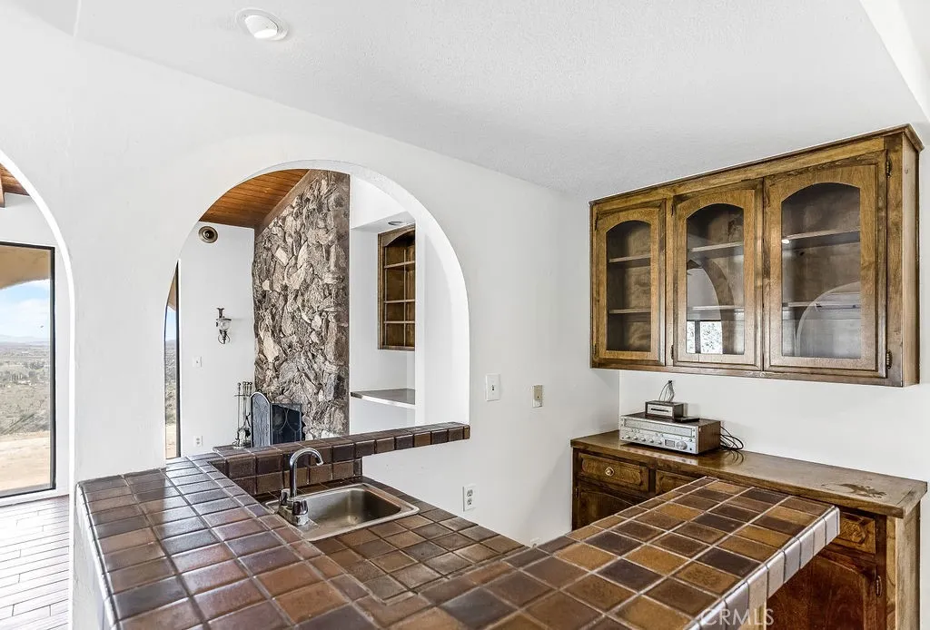 ** Honey Stop The Car! ** The Mount Ridge Estate Is Finally Available! This stunning three-bedroom, two-bathroom Santa Fe home boasts over 2,335 square feet of living space, nestled atop your own private mountain and surrounded by 2.7 acres of prime high desert real estate! The drive to this unique property sets the mood. As you travel through one of the most sought-after neighborhoods, youll see well-cared-for homes adorned with lush desert flora and majestic mountains in the backdrop. As you pull up the private driveway, youre greeted by beautiful boulders, thoughtful landscaping, and a character-driven Santa Fe Adobe aesthetic. Walking through the double-gated courtyard, youll realize this is no ordinary home. Inside, youll be impressed by the modern open floor plan! Tile flooring, open wood beam high ceilings, and abundant natural light flow through oversized floor-to-ceiling windows, creating an airy feeling throughout. A beautifully designed dual fireplace featuring elegant tile and mid-century rock faades splits the den and large living room. Designed for entertaining, the remodeled kitchen opens to the dining and living areas. It boasts quartz countertops, a mosaic backsplash, stainless steel appliances, a double sink, and plenty of cabinetsperfect for culinary delights! Youll also find a spacious dining room with a luxurious wet bar outfitted with display cabinets and wraparound tile countertops. Each guest bedroom feels like a primary room and includes ample closet space, built-in desks, ceiling fans, and windows with a view! The guest bathroom features a stylish