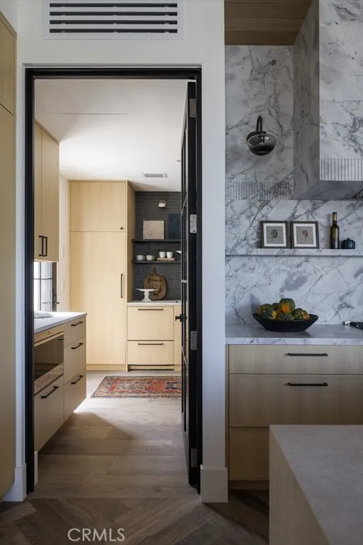 Set within the guard-gated enclave of Big Canyon in Newport Beach, this newly completed residence by JFB Custom Homes, designed by Aust Architects with interiors by Morrison Interiors, reflects a quiet sophistication where natural materials, refined craftsmanship, and thoughtful proportions create a home of enduring serenity. A dramatic double-height entry with approximately 20-foot ceilings introduces the home, where bespoke lighting, rich herringbone wood flooring, and beautifully crafted custom cabinetry establish a quiet sense of luxury. From the foyer, a dramatic sightline extends through the home, across the infinity-edge pool to sweeping vistas of Big Canyon Country Club and the mountains beyond. Interiors are shaped by a palette of warm oak, honed stone, and soft natural textures, creating an atmosphere of effortless harmony throughout. Light filters through carefully framed openings, illuminating spaces that feel generous yet intimately scaled. At the heart of the home, the kitchen serves as both gathering space and sculptural focal point. An elegant stone island anchors the room beneath custom pendant lighting, while warm wood cabinetry and dramatic veined stone create a layered interplay of texture and tone. A fully appointed butlers pantry with its own suite of appliances provides seamless support for both everyday living and entertaining. The great room opens fully through expansive pocketing walls of glass, dissolving the boundary between indoors and out and embracing the essence of Southern California living. Beyond, a dramatic infinity-edge pool and spa over