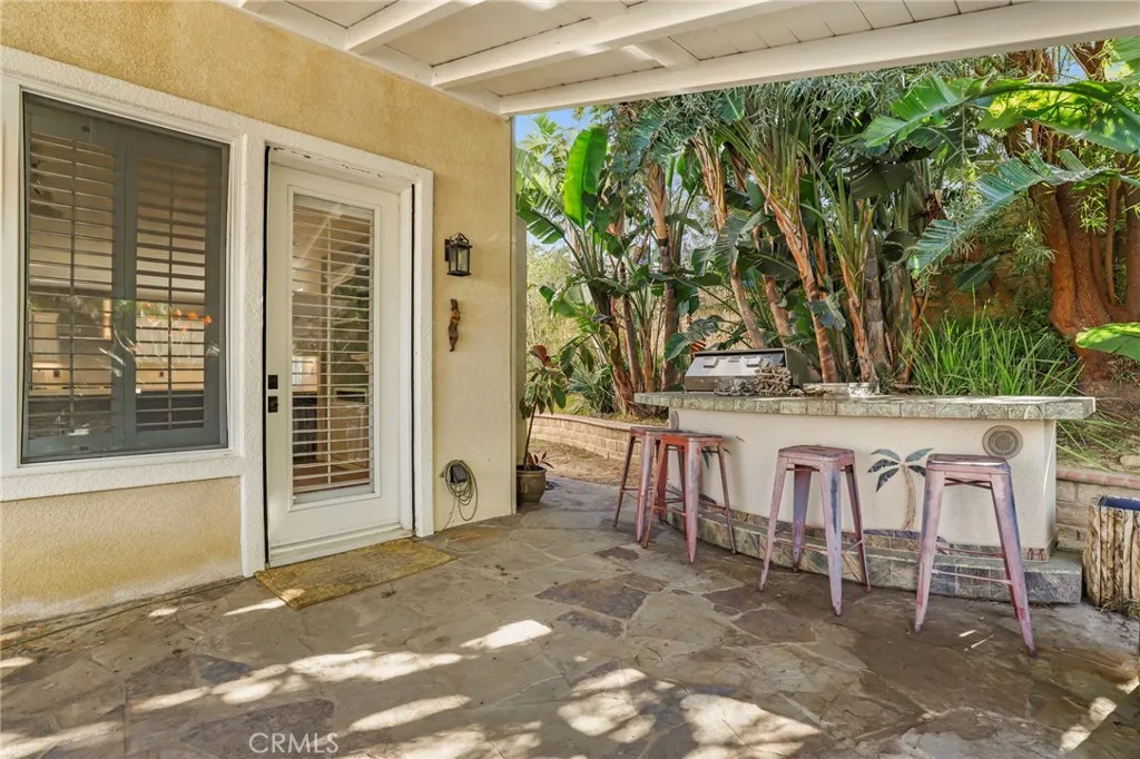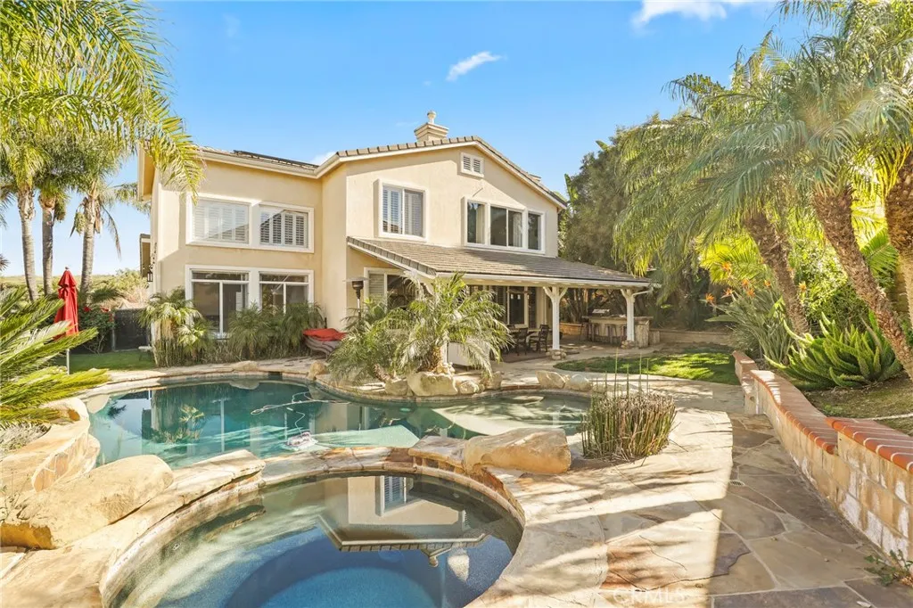 Experience the perfect blend of comfort and privacy in this exceptional four-bedroom, three-bath residence nestled in the heart of Simi Valley. From the moment you enter, sunlight streams through expansive windows, illuminating the airy, open-concept layout and creating a warm, welcoming ambiance. A charming brick walkway sets the tone, leading into an elegant living area adorned with plantation shutters, oversized windows, and a formal dining room ideal for memorable gatherings. The thoughtfully remodeled island kitchen features newer stainless-steel appliances, stunning quartz countertops, and ample workspaceperfect for everyday living and effortless entertaining. Just beyond, the inviting family room centers around a beautiful brick fireplace, complemented by custom built-ins and seamless access to the expansive patio. Upstairs, three spacious secondary bedrooms accompany a serene primary suite, complete with a private en-suite bath and sweeping hill views that offer a peaceful retreat at the end of the day. Outdoors, your private backyard oasis awaits. A covered patio and fully equipped outdoor kitchen provide the ultimate setting for entertaining, while the sparkling custom poolwith color-changing lights and a tranquil waterfall spacreates a resort-like escape framed by lush landscaping. With scenic views, tasteful upgrades, and a desirable location near shopping, schools, and convenient freeway access, this remarkable home offers the lifestyle youve been searching for. Dont miss this rare opportunity.