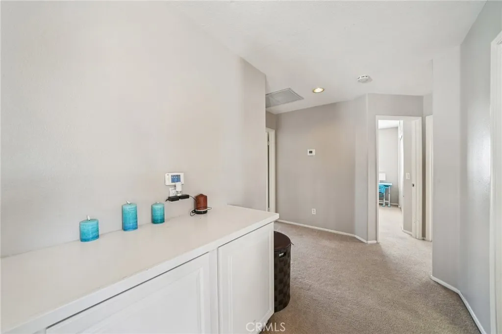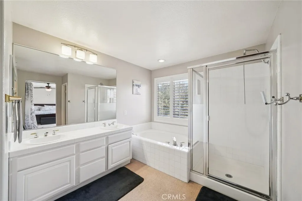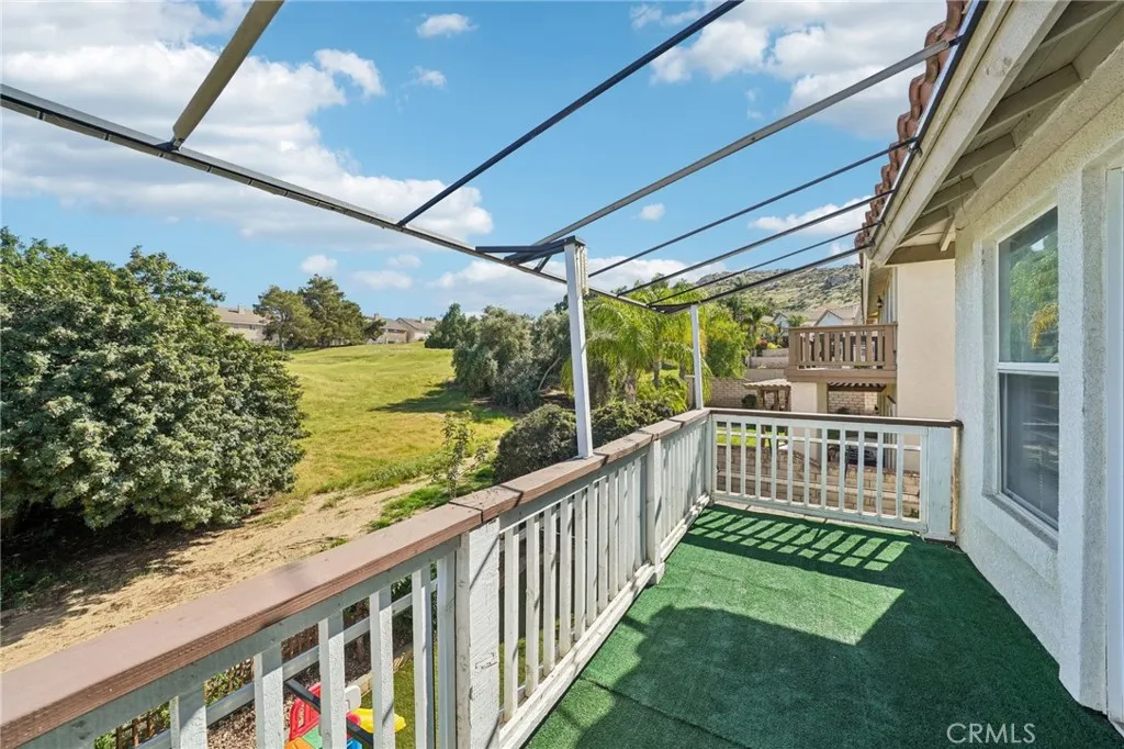 This charming home features a well-designed 4-bedroom, 3-bath floor plan, including one bedroom and a full bathroom conveniently located downstairs. The open layout offers comfortable living spaces filled with natural light and wooden shutters throughout. The living area includes a brick fireplace and connects easily to the dining area and kitchen, creating a functional space for everyday living and entertaining. The kitchen overlooks the main living area and offers pull-up seating and stainless steel appliances. The spacious primary bedroom includes an ensuite bathroom with a walk-in shower and soaking tub. A sliding glass door provides access to the backyard, allowing for easy indoor-outdoor living. The backyard backs to a greenbelt and features low-maintenance turf and a covered outdoor seating area. A private balcony overlooking the greenbelt provides an additional outdoor retreat. Additional highlights include a 3-car garage.