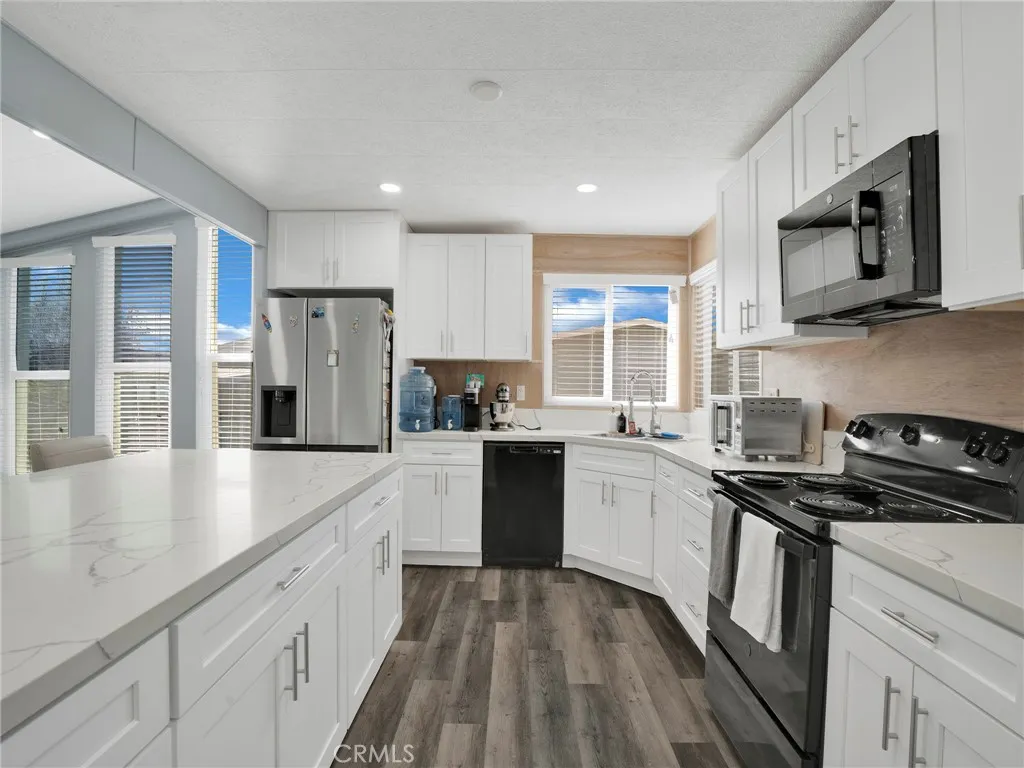 Welcome to this beautifully upgraded 3-bedroom, 2-bathroom manufactured home offering 2,312 square feet of spacious living in the privately gated community of Mountain View Village. Thoughtfully maintained and enhanced with numerous major upgrades, this home provides comfort, style, and peace of mind. Recent improvements include a brand-new HVAC system, all new Milgard dual-pane windows and doors, a new water heater, newer roof, and fresh interior paint throughout, making this home truly move-in ready. A charming covered front patio welcomes you inside to a bright and centrally located living room, filled with natural light and seamlessly connected to the formal dining area, creating an inviting space ideal for everyday living and entertaining. The updated kitchen features quartz countertops, modern appliances, a large center island with countertop seating, and ample cabinet storage. Just off the kitchen is a cozy den or sitting area, perfect for a more intimate gathering space, reading nook, or media area. The spacious primary suite offers a relaxing retreat, complete with an ensuite bathroom featuring a private powder area, dual vanity, jetted soaking tub, and separate walk-in shower. Two additional guest bedrooms provide comfortable accommodations, with one offering convenient access to a guest ensuite bathroom that functions as both a private and hall-accessible bath for visitors. Adding to the homes functionality is a separate laundry room equipped with built-in cabinetry and a utility sink, providing plenty of space and convenience for all your laundry needs. Outside,