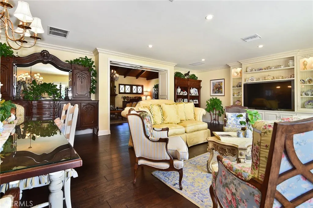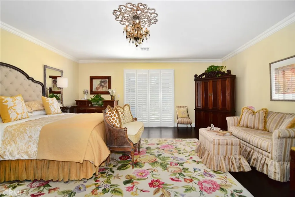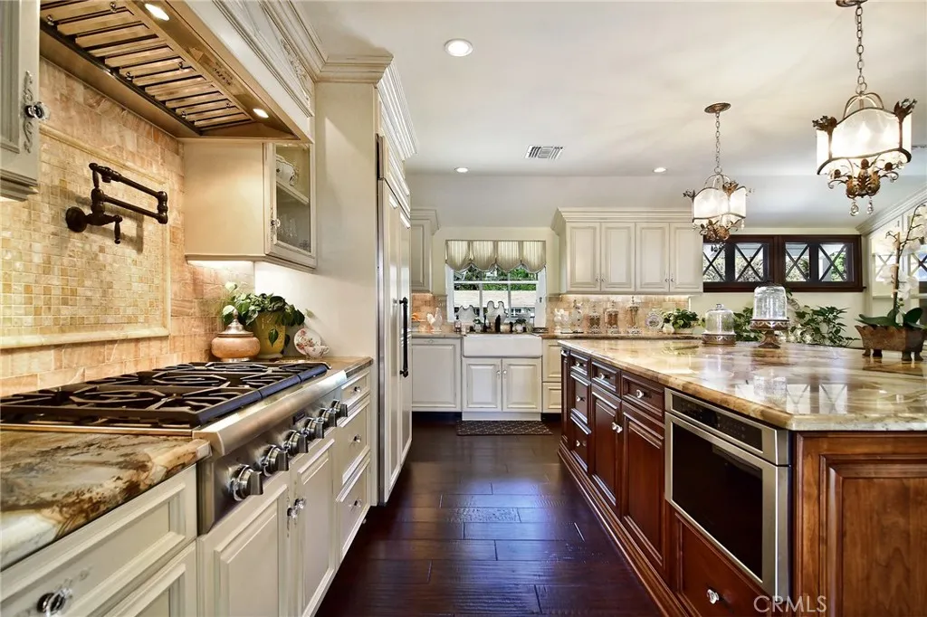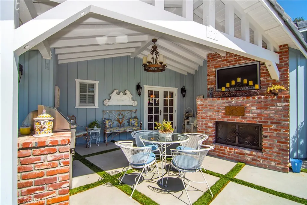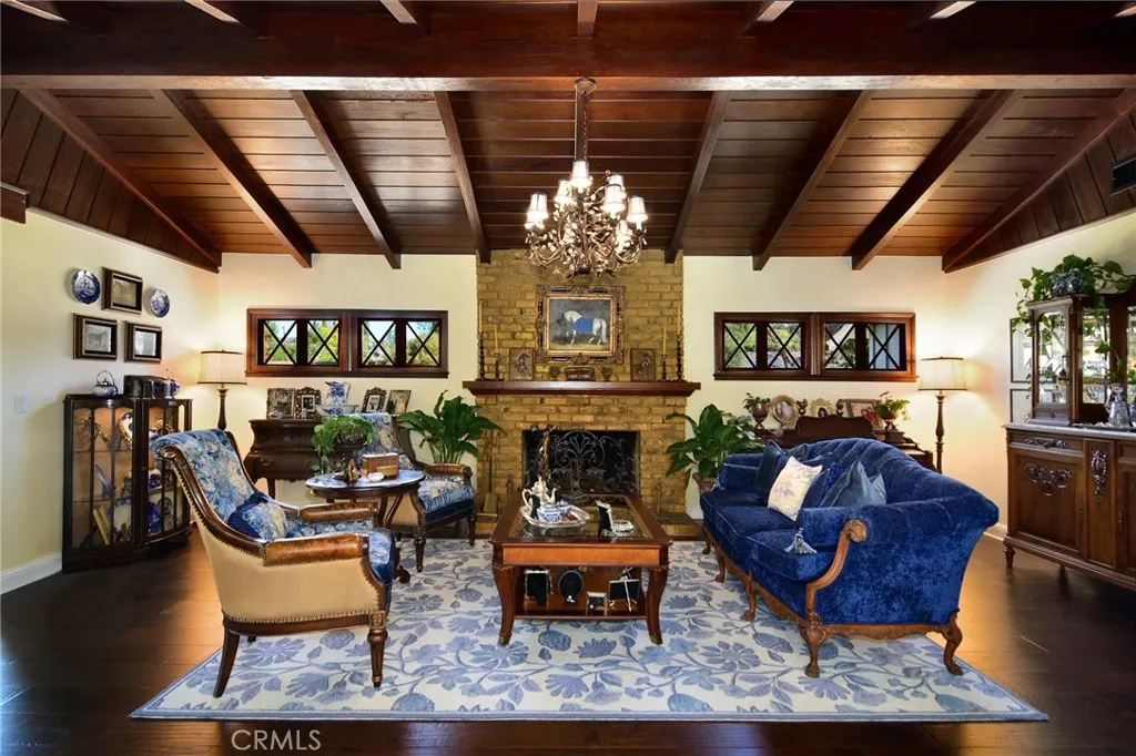 Experience the dazzling restoration of this rustic style single-level ranch affording a classic olde Hollywood vibe. Situated on a flat nearly half-acre of sensational grounds featuring over 150 ft. of gated frontage adorned with roses, circular drive, brick accents, lush lawn & slate roof. Love at first sight is a quite the possibility here. An incredible over 600 sq. ft. guest house elevates it to another level. Both inside and out, the vision and style of its proud owners are prominently displayed. Gorgeous wood flooring blankets the interior. Living room with an inviting fireplace and the allure of original A-framed wood ceilings define this cherished space. A spectacular dream kitchen offering custom cabinetry, quality appliances and a massive center-island with exquisite Palomino granite adjoins a gorgeous butlers pantry. Spacious & bright family room & formal dining benefit from a beautiful brick fireplace. Unique convertible den is a favored destination enhanced by a distinct curved fireplace. Your amazing primary-suite delivers a refined walk-in closet, French doors to the rear & an ultra-luxurious bath where white onyx walls & floors, soothing spa tub & a 6 shower provide a true haven within. Two additional en-suites with stunning baths are sure to please. Outside, these glorious grounds truly rival that of a 5-star resort. Refreshing solar-heated pool and spa framed by the elegance of concrete decking with faux grass definition is just divine. An ideal covered dining and relaxation area offer a cozy fireplace & T.V. Bountiful fruit trees and a basement/storage ro