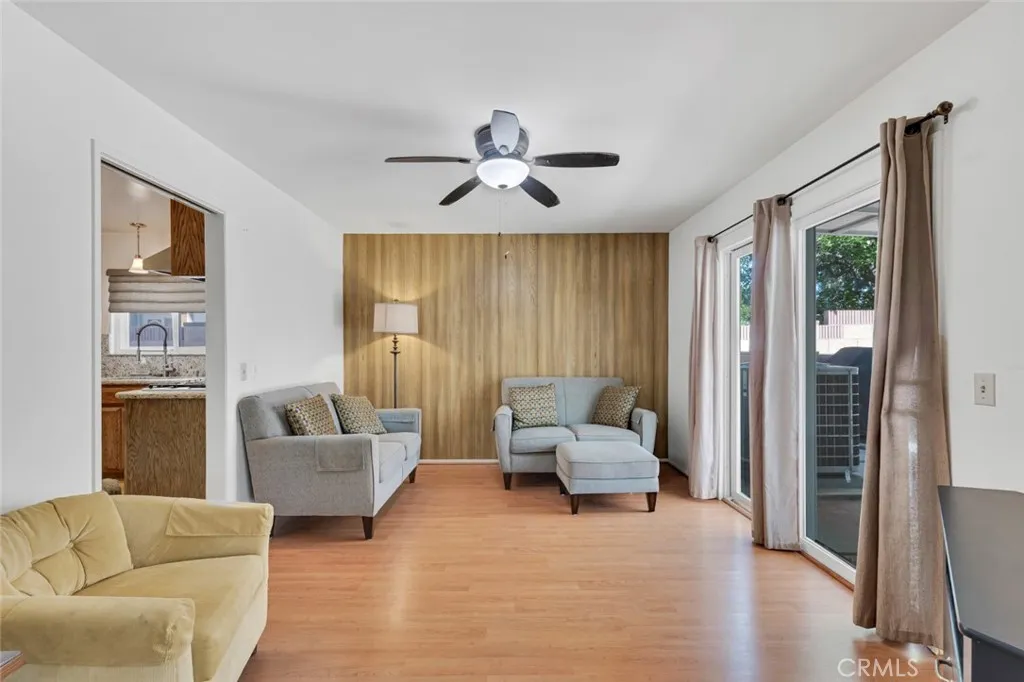 Mid-century character, generous living spaces, and a well-maintained presentation come together in this inviting 4 bed, over 2000 sq ft Granada Hills home. Set within a desirable residential neighborhood and framed by palm trees, a grassy front lawn, and a gated front courtyard, the home offers attractive curb appeal and a welcoming sense of privacy from the moment you arrive. Inside, a classic floorplan of living space flowing from one room into another, blends mid-century aesthetic with modern sensibility, creating a comfortable space designed for both everyday living and entertaining. The spacious living room is anchored by a large white brick fireplace and opens through a glass slider to the backyard, while the formal dining area showcases a distinctive wood-paneled accent wall with decorative detail. A separate den/informal living space with its own paneled wall, ceiling fan, and slider to the patio adds flexibility and warmth. The kitchen is the heart of the home, featuring granite counters, wood cabinetry, stainless steel double ovens, a stainless range hood and cooktop, and an adjoining, sunny, breakfast area with picture window and ceiling fan. Down the hall are all the bedrooms as well as access to the bonus area upstairs. The primary suite offers vaulted ceilings, a large walk-in closet, and an updated bath with granite vanity and a tile walk-in multi-head shower. Three additional good-sized bedrooms share an updated, full hall bath with dual sink vanity. Upstairs is a finished attic space, with dedicated wall unit AC, accessible via a pull-down staircase, that c