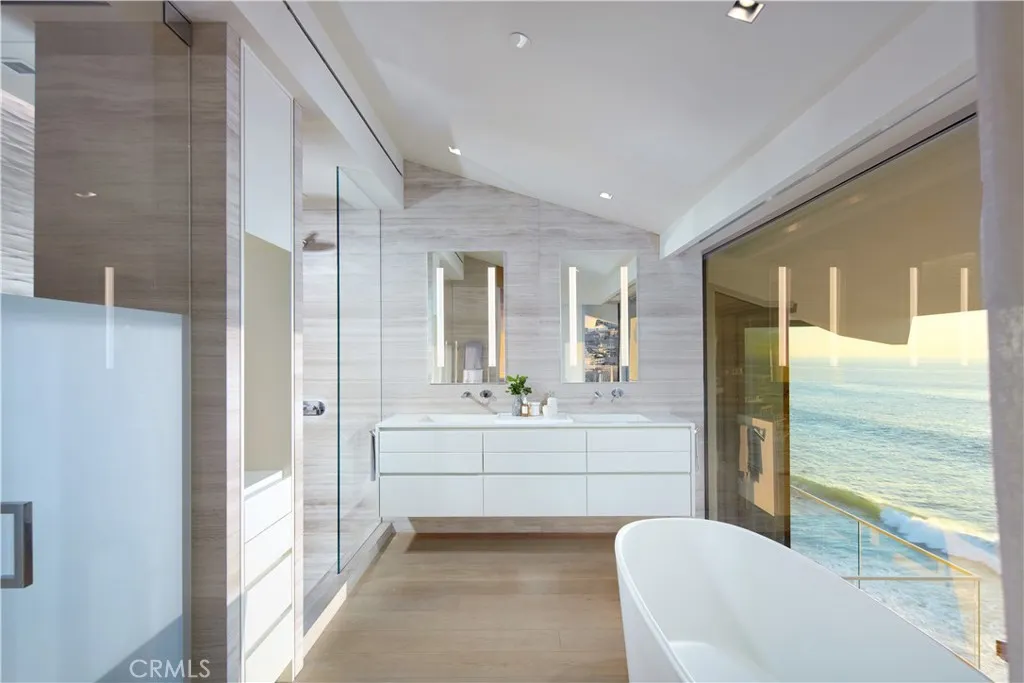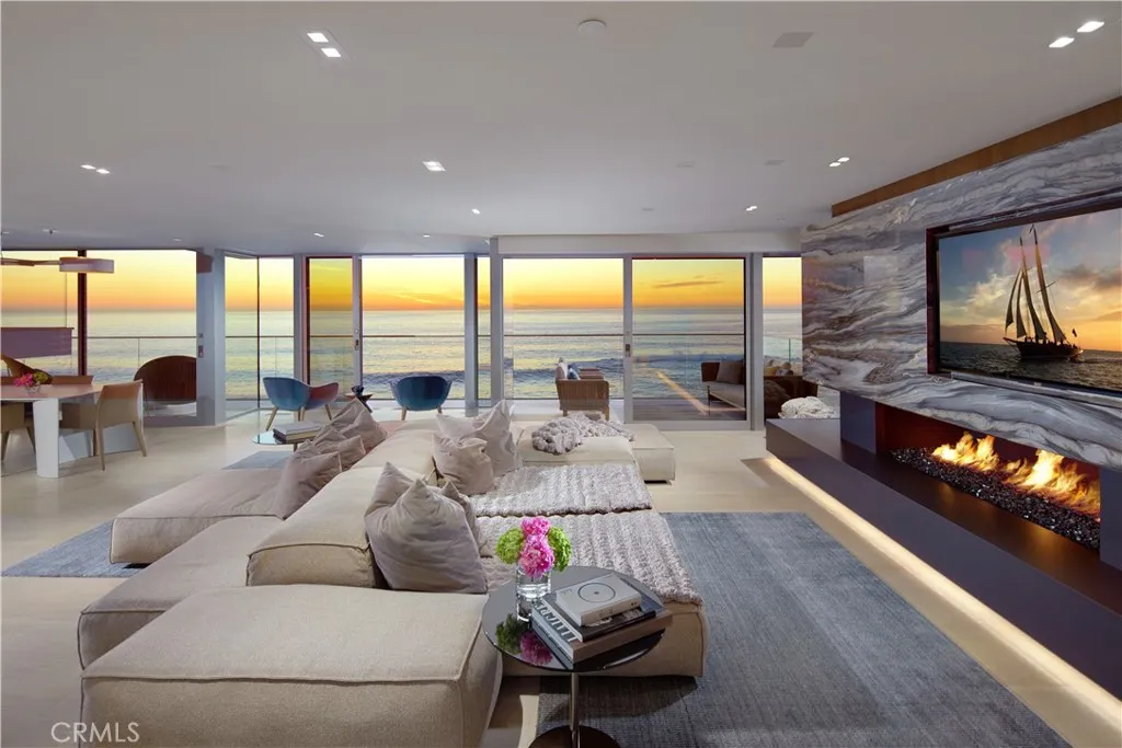 Perched above the sand on Laguna Beachs most sought-after shoreline, this architectural masterpiece offers 79' of beach frontage with breathtaking panoramic ocean and coastline views. Painstakingly rebuilt by renowned interior design firm Aria Design and architect Anders Lasater, the beachfront residence boasts an unparalleled array of luxurious amenities including private steps descending to Laguna's highly coveted Victoria Beach. Spanning approximately 3,541 square feet across a split-level layout, the residence encompasses three bedrooms (including a tranquil meditation room), two offices, and three-and-one-half baths. At its heart lies a SieMatic kitchena chefs dream outfitted with quartz countertops, and two sets of Gaggenau ovens, Sub-Zero refrigerators, and Miele dishwashers. A custom bar area with Sub-Zero fridge/freezer drawers enhances entertaining, while floor-to-ceiling glass Fleetwood doors showcase mesmerizing ocean views and bathe the home in natural light. Exceptional details include a glass-enclosed refrigerated wine display with storage for 216 bottles and Isokern fireplaces in the living room and primary suite. Approximately 1,200 square feet of outdoor decks and terraces include features such as Infratech ceiling heaters, an outdoor lounge with bar, a water element, living wall, and firepits, creating numerous peaceful verandas. The primary suite is a private haven complete with heated towel racks and exquisite finishes. Exterior highlights include limestone and porcelain details, a copper roof, and EnduroShield-treated glass railings. Expansive decks an