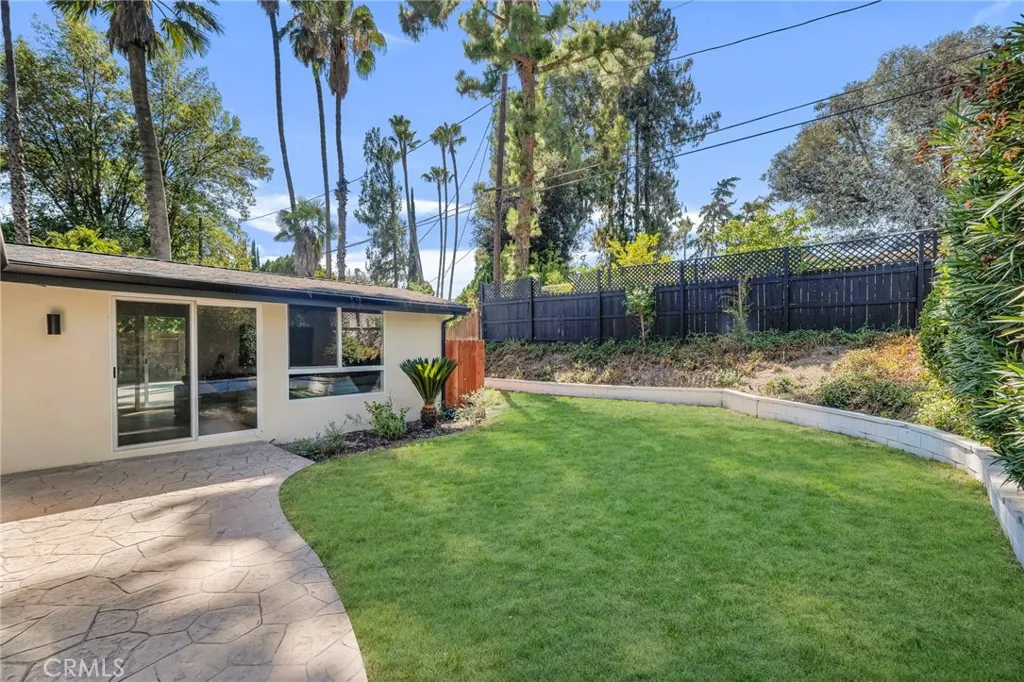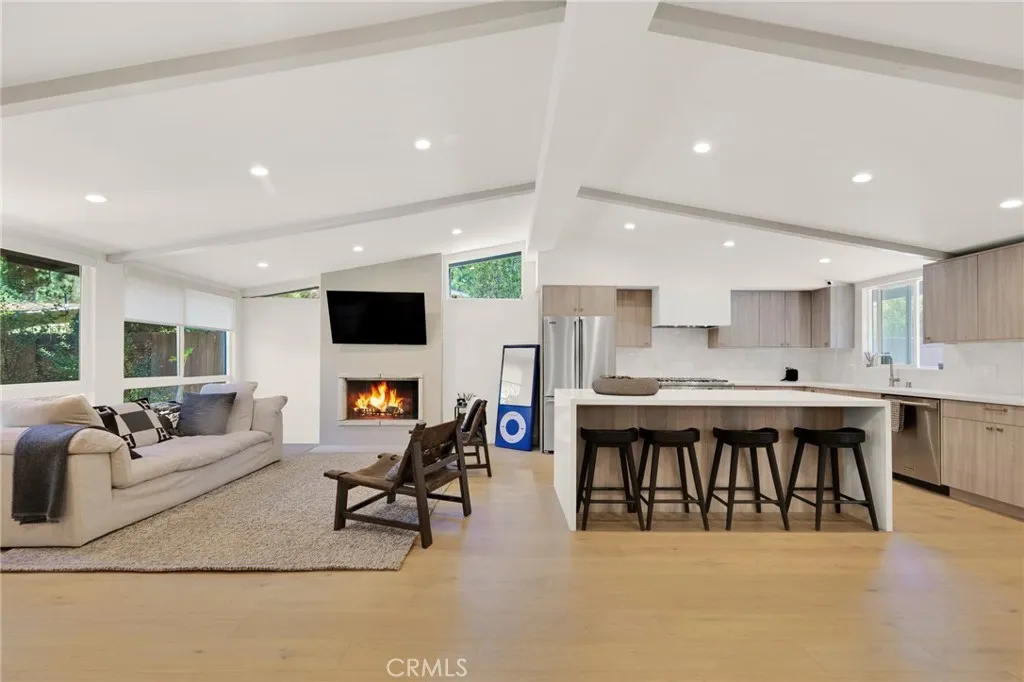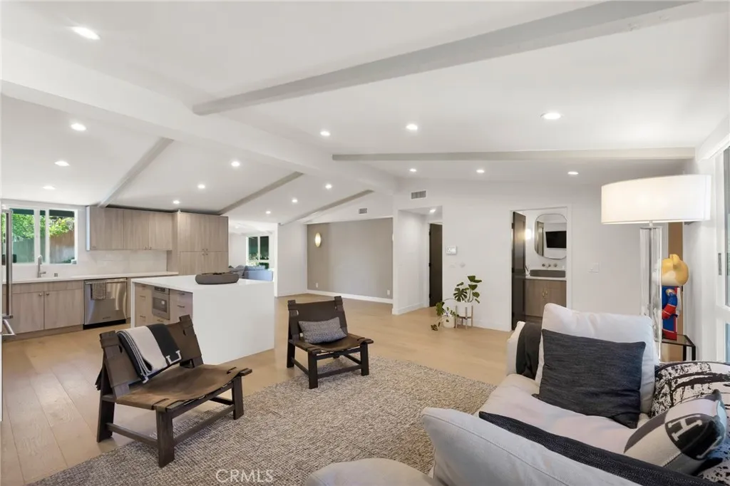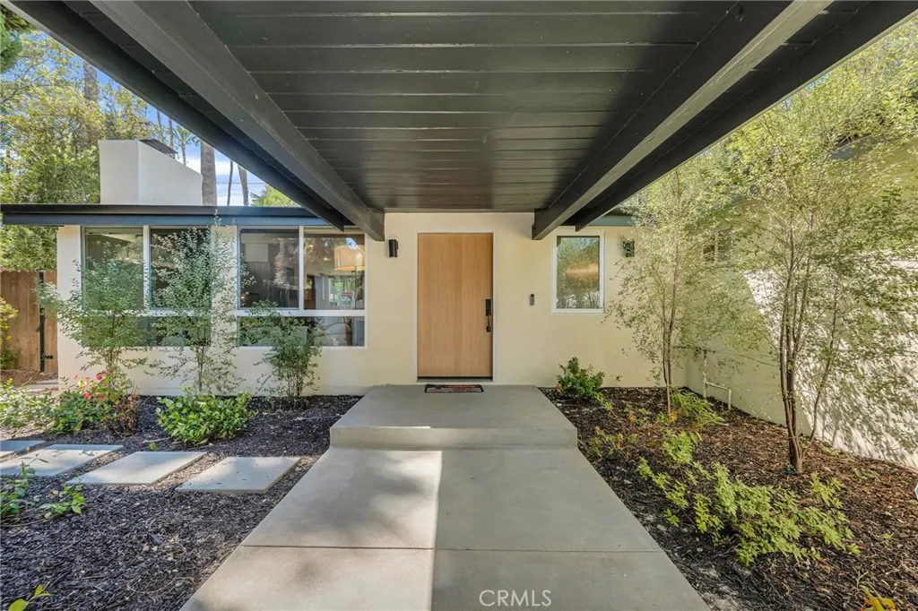 Experience the perfect blend of style and comfort in this beautifully reimagined mid-century modern single-story pool home, ideally situated south of the boulevard in a beautiful sought-after Woodland Hills neighborhood. Originally renovated about three years ago (2023) with high-end finishes and thoughtful design, the home has been lovingly maintained to preserve its like-new feel. Step through a lush, private courtyard into a light-filled living space with soaring beam ceilings and courtyard views. The open-concept great room features European engineered wood floors, an updated fireplace, and a dining area ideal for gatherings. The chefs kitchen boasts Viking stainless steel appliances, a generous center island with seating, custom flat-panel cabinetry, quartz counters, and a full-height tile backsplash. Designed for seamless indoor/outdoor living, this 3-bedroom, 2.5-bath home offers a family room that flows to the pool, firepit, and patio, plus a separate grassy yard. The primary suite includes a custom walk-in closet, spa-like en-suite bath, and direct patio access with serene views. A secondary bedroom also opens to the garden. Extensive upgrades from the renovation done in 2023 include designer fixtures, new windows, roof, HVAC, tankless water heater, updated plumbing/electrical, refreshed pool with new coping, plaster, tile, LED lighting, and more. Close to Ventura Blvds dining and shopping, The Village, Westfield Topanga, Calabasas Commons, award-winning schools, beaches, and the 101 Freewaythis home offers a private retreat with unbeatable convenience.