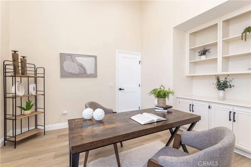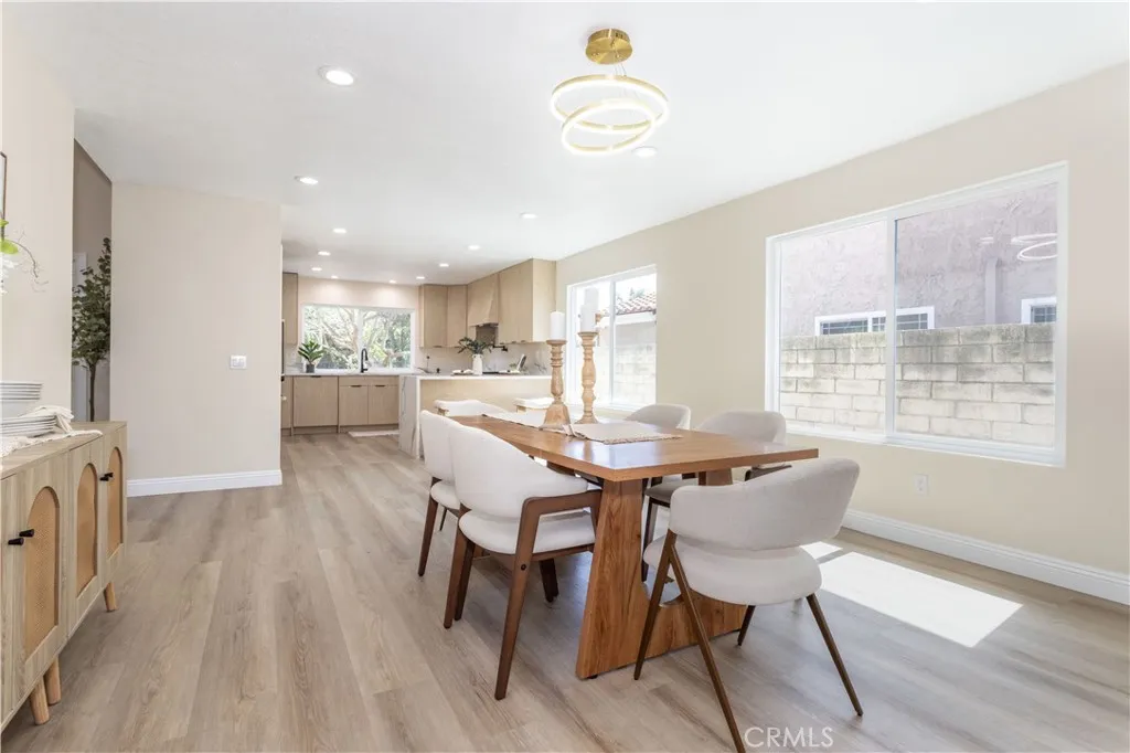 Looking for a completely remodeled single-story home in Porter Ranch thats truly turnkey and designed for modern living? This Porter Ranch home for sale offers the perfect blend of style, space, and thoughtful design with 4 bedrooms, 2 bathrooms, 2,329 sq ft of living space, and an expansive 11,002 sq ft lot. Step through the double door entry into a formal entry that opens into a light-filled, open-concept great room. The sunken living room creates a defined yet connected space, highlighted by a designer fireplace and soaring vaulted ceilings that add volume and architectural character. Just beyond, the formal dining room flows seamlessly, making the layout ideal for both everyday living and entertaining. The chefs kitchen is a true centerpiece, featuring sleek quartz countertops with a waterfall edge, European flat-panel white oak cabinetry, and a premium Thor stainless steel appliance package by Gordon Ramsay, complete with a pot filler and generous pantry. The adjacent family room provides an inviting second gathering space and includes a custom wet bar finished in matching cabinetry, allowing for effortless entertaining and service between living areas. Wide-plank LVP flooring runs throughout, creating a warm and cohesive modern feel. The primary suite offers a true retreat with generous space and custom built-in shelving complete with a rolling ladder, adding both character and versatility. The beautifully remodeled primary bathroom features a floating vanity, soaking tub, and designer finishes that create a spa-like atmosphere. Three additional bedrooms provide flexi