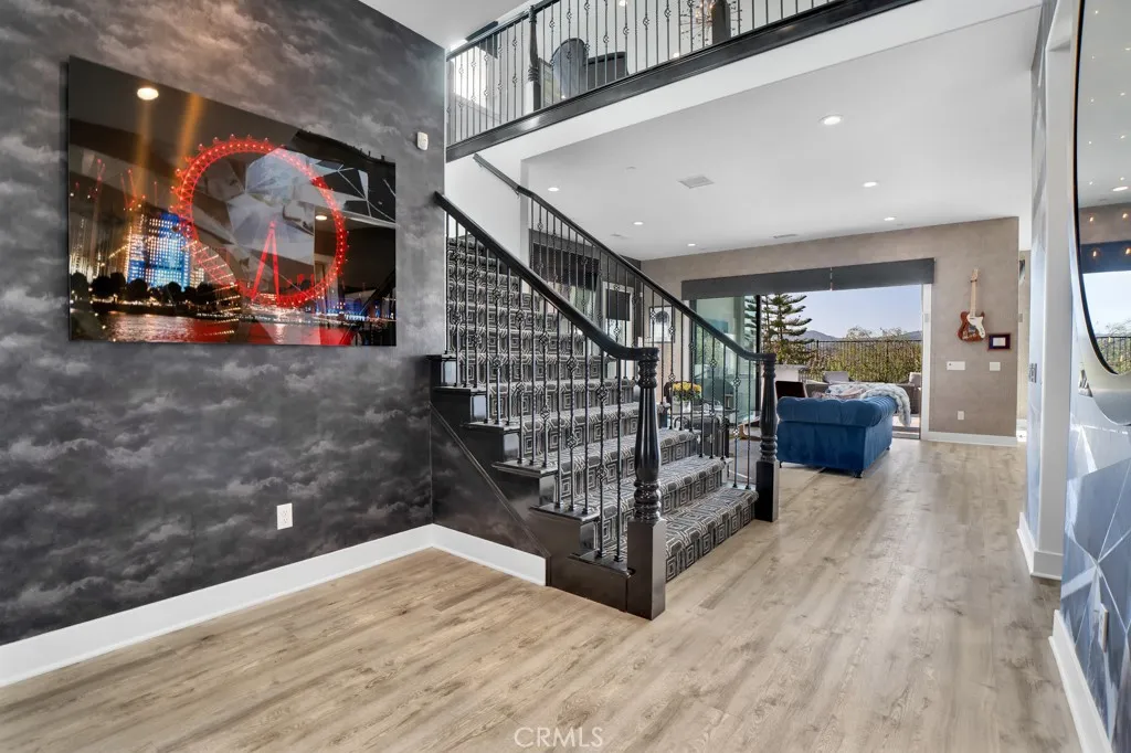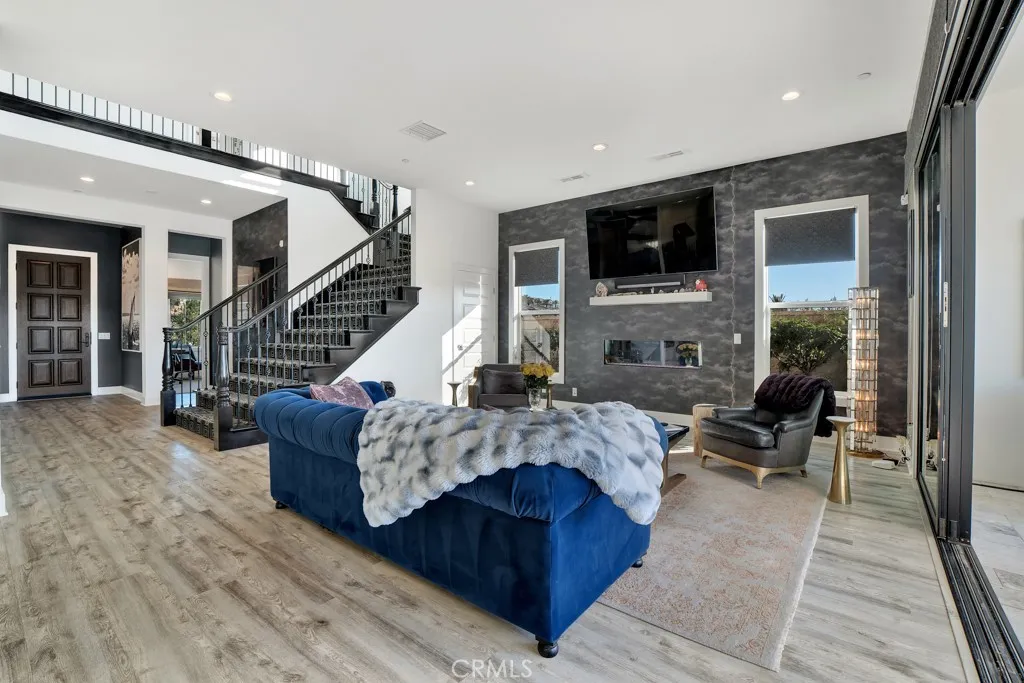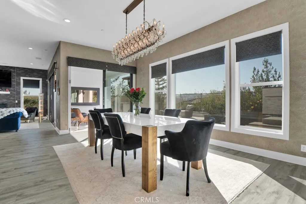 Nestled within the prestigious gated community of Avila, this exceptional residence offers approximately 3,560 square feet of refined living, thoughtfully designed with 4 bedrooms and 4.5 baths situated on a $100,000+ premium end lot with sweeping views from the mountains to valley, and only one neighboring home. Created in 2018, the home reflects a seamless blend of modern elegance, designer upgrades and custom finishes. From the moment you arrive, the striking curb appeal and professionally designed groundscrafted by Green Scene with over $350,000 invested and an award-winning spaset the tone for a truly elevated living experience. Inside, soaring volume ceilings and expansive windows fill the home with natural light, framing picturesque hillside vistas and breathtaking sunsets. The open-concept main living area is anchored by a chefs kitchen featuring stainless steel appliances, stone countertops, custom cabinetry, a walk-in pantry, and an oversized center island. The kitchen flows effortlessly into the dining area and family room, where a fireplace creates a warm yet sophisticated gathering space. Wall-to-wall sliding glass pocket doors open to a covered patio with a second fireplace and TV, creating a seamless indoor-outdoor lifestyle ideal for entertaining. The private backyard is a true resort-style retreat, complete with an award-winning spa. A highly desirable downstairs bedroom suite offers its own bath, perfect for guests, home office or multigenerational living. Upstairs, the home features multiple en-suite bedrooms, including a luxurious primary retreat with hi