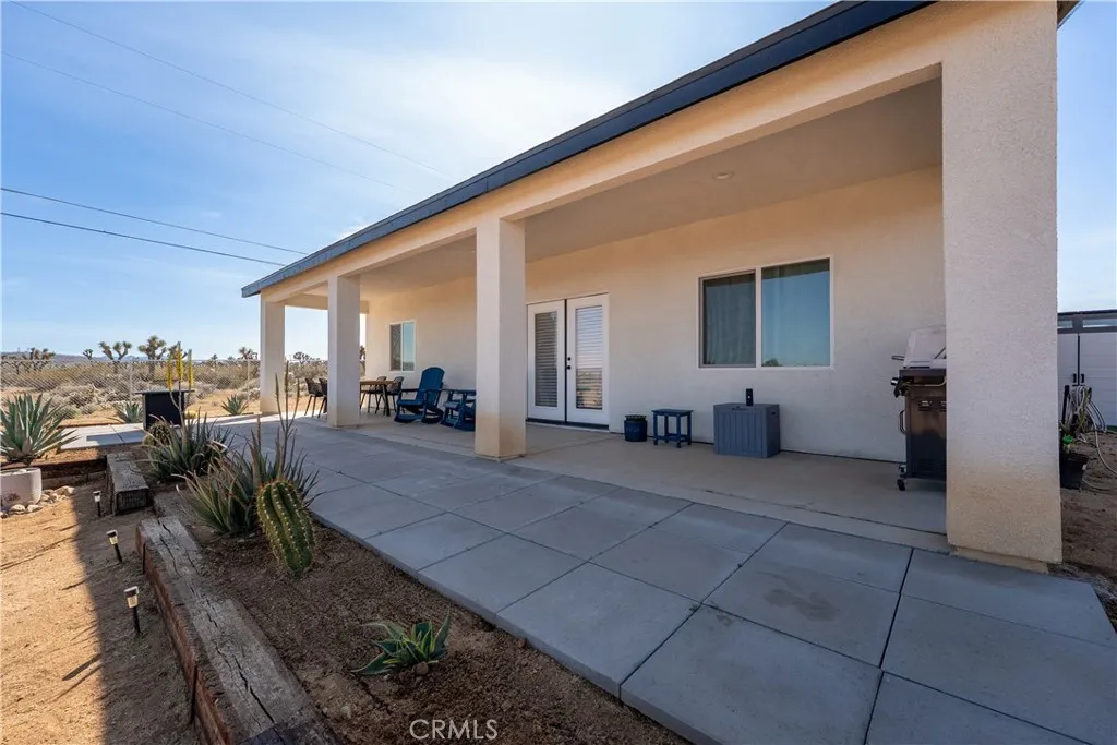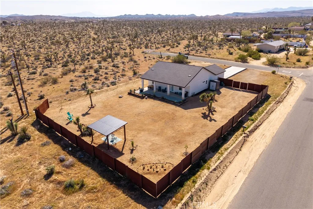 Welcome to this newer construction home set on a spacious half-acre lot, offering the perfect blend of modern comfort, privacy, and endless potential in a peaceful desert setting. Designed as a versatile retreat, this property provides room to expand, customize, and truly make your ownplus the option to purchase the adjacent lot for even greater opportunity. Enjoy a private and tranquil environment surrounded by wide-open desert views, natural Joshua trees, and partial views of Mount San Jacinto, creating a serene backdrop and open-sky living. Inside, the home features a bright, open floor plan with 9-foot ceilings, creating an airy and inviting atmosphere. The kitchen is equipped with stainless steel appliances and flows seamlessly into the main living area, ideal for both everyday living and entertaining. The outdoor space offers exceptional flexibility and usability. The fully fenced yard includes landscaped and hardscaped areas, along with a gazebo with lighting, perfect for relaxing or hosting. With ample space, the property can easily accommodate a pool or spa, ADU, RV or OHV parking, and expanded outdoor entertaining areas. Additional features include an owned solar system to help keep energy costs low, EV charger in the attached 2-car garage, Ecobee HVAC system, Wyze doorbell camera, paved driveway access, and a backyard storage shed. With no HOA, generous land, and a flexible layout, this property is ideal as a primary residence, vacation home, or investment opportunity, offering both immediate comfort and long-term potential in a quiet, growing area.
