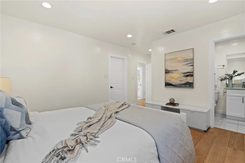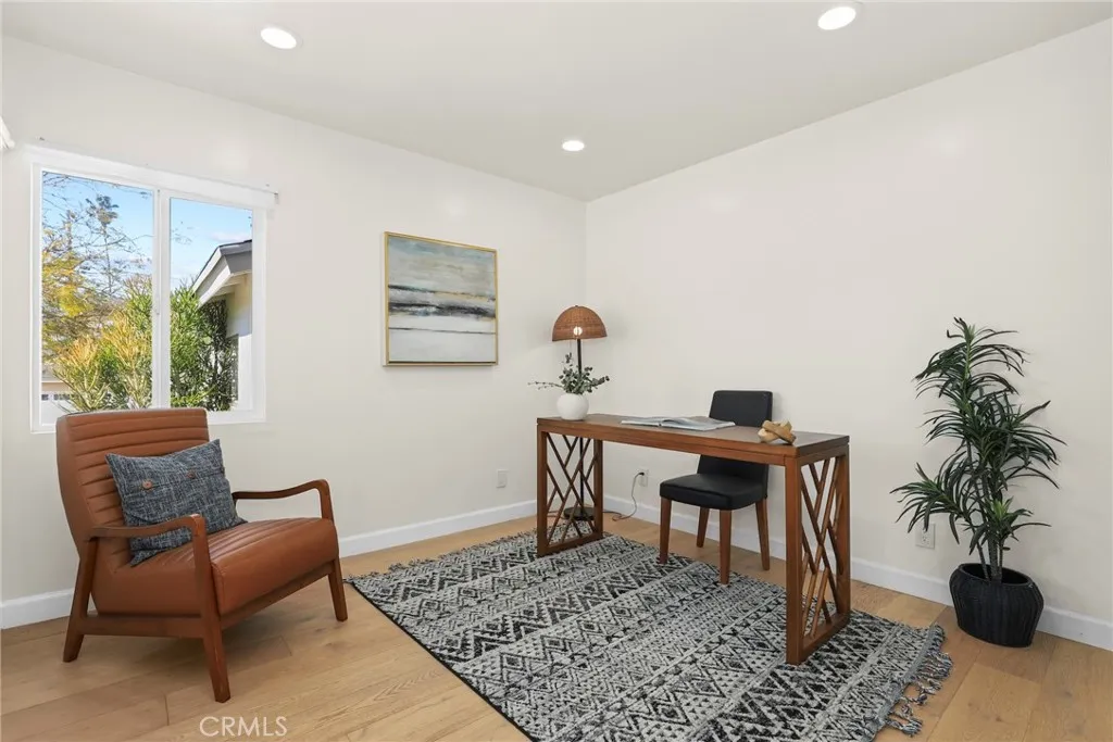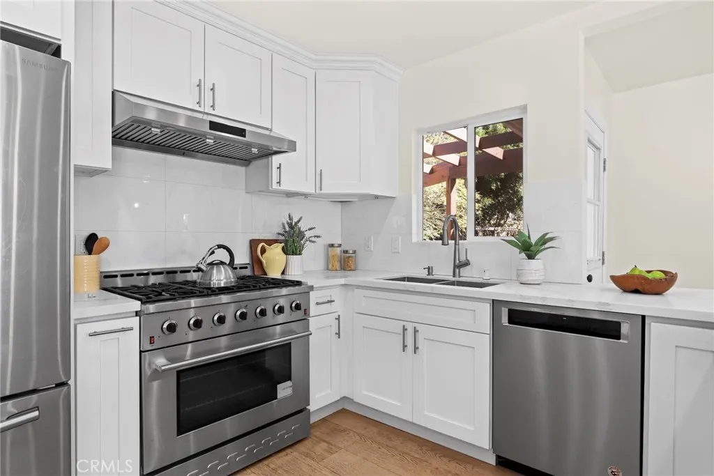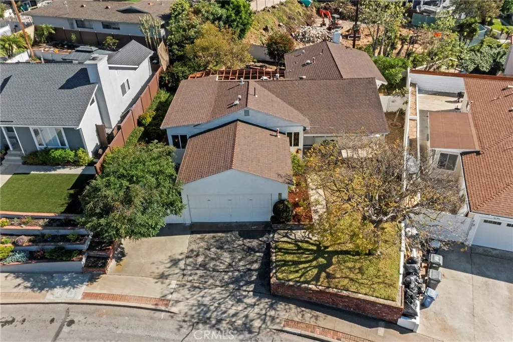 Beautifully remodeled, single-story home, ideally situated on an oversized, quiet cul-de-sac lot, offers exceptional indoor/outdoor living. The interior has been updated to a modern style, featuring wide-plank floors, recessed lighting, and a highly functional floor plan. The heart of the home is the great room, which encompasses a wonderful kitchen with quartz countertops, ample storage, and a breakfast bar overlooking the living and dining areas. Outside, a large patio is perfect for gatherings, while the spacious yard provides plenty of room for kids and pets. Mature trees offer shade, and fruitful orange trees yield seasonal harvests. The primary suite is a true retreat, boasting a large bedroom with a cozy fireplace, a sumptuous bathroom complete with a dual vanity, soaking tub, and walk-in closet. Separately located on the other side of the home are three generously-sized secondary bedrooms. These feature large mirrored closets, with one offering an ensuite bathroom, and the other two sharing a hallway bathroom. Enjoy the comfort of central AC and the peace of a quiet neighborhood, all while benefiting from the convenience of this prime location.