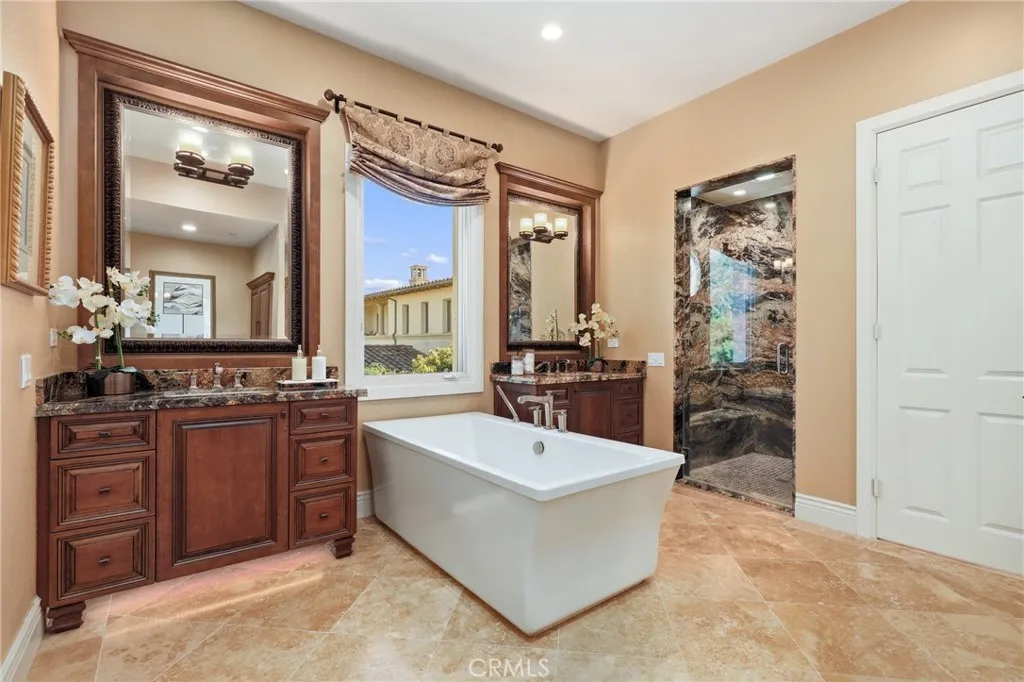 Gracefully positioned on a tranquil cul-de-sac within the prestigious guard-gated Ocean Heights enclave of Newport Coast, this elegant residence offers 4 bedrooms, 4.5 baths, and 4,000 square feet prime coastal living space. An inviting courtyard framed by mature olive trees creates a warm arrival, setting the tone for the elegance that unfolds inside. A dramatic entry welcomes guests with soaring 20-foot ceilings and custom stone flooring, creating a grand first impression. The main level is designed for seamless indoor-outdoor living and features a spacious living room, formal dining room, family room, and sunlit breakfast nook, each with French doors opening to beautifully landscaped outdoor spaces. The chefs kitchen showcases custom cabinetry, a generous center island, and professional-grade appliances including Viking double ovens and six-burner gas cooktop, Sub-Zero refrigeration, Thermador dishwasher, and Perlick beverage refrigerator. Everpure water filtration, designer lighting, and motorized window shades add sophistication. The family room features a custom built-in entertainment wall, gas fireplace, integrated lighting, and surround sound wiring. The resort-inspired backyard was completely redesigned with a spa and water feature, stone pavers, low-maintenance landscaping with premium artificial turf, and a fully equipped outdoor kitchen outfitted with Lynx grilling equipment, dual gas burners, sink, beverage refrigerator, and custom Danver stainless steel cabinetry. The central courtyard offers a gas fire pit with seating for intimate gatherings and integrated o