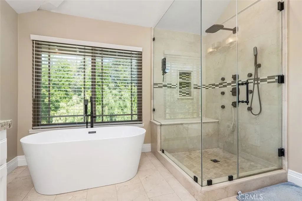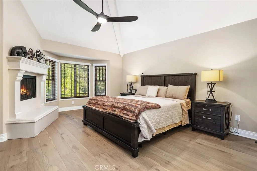 Beautifully upgraded North Ranch townhome that lives like a single-family home, featuring soaring ceilings and an open, spacious layout. The home offers a large living room, separate family room, and an eat-in kitchen with breakfast nook, creating a seamless flow ideal for both everyday living and entertaining. Both the living room and family room feature fireplaces, adding warmth and charm throughout. This 3-bedroom home includes a stunning primary suite with its own fireplace and a spa-like, upgraded bathroom. Recent improvements include fresh interior paint throughout (walls, trim, and stair railings), all new light fixtures, and brand new engineered white oak flooring upstairs. The home is thoughtfully enhanced with custom built-in closets, additional hallway cabinetry with stone countertops and two linen closets, and a custom wet bar with solid stone counters and limestone backsplash. The secondary bathroom has been updated with a new vanity, lighting, mirrors, and fixtures, and the powder room has been fully remodeled. Additional upgrades include improved laundry storage and new landscaping in much of the backyard. The private outdoor space is a true highlight, featuring a pool and dedicated BBQ area, perfect for relaxing or entertaining. Ideally located close to the community pool and clubhouse, this home is situated in the prestigious North Ranch neighborhood near the golf course. Offering exceptional privacy, the home shares only a minimal portion of one wall with a neighboring property. A rare opportunity to own a highly upgraded home with exceptional indoor-outdo