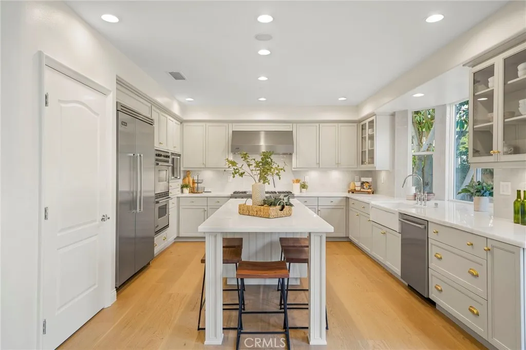 Welcome to the newest gem in the prestigious guard-gated Ritz Pointe community! This newly renovated home inside and out boasts the largest floor plan in the community with 5 bedrooms, 4 bathrooms, a designer kitchen, and multiple living spaces perfect for entertaining. Starting with the exterior, a beautiful mature olive tree, mature cypress trees and fresh landscaping adorn the front of the home along with a brand new diamond patterned driveway. As you enter the home, you are greeted with an expansive foyer with 20 ceilings and checkered Italian marble and limestone flooring which transitions into 10.5 wide engineered white oak wood flooring throughout the rest of the home. The main level features a large dining room with custom cabinetry, multiple living areas and a gourmet kitchen equipped with new quartzite countertops, genuine brass hardware, and professional-grade Viking appliances. The versatile layout includes a rare downstairs bedroom, while the upper level houses a dedicated office, a private media room perfect for special movie nights, and the remaining bedrooms including the sprawling primary bedroomcomplete with his and her closets and a grand spa-like bathroom. The home was meticulously designed to balance the practicality of daily living with the beauty of the natural world utilizing a series of coastal tones and materials. The resort theme extends to the backyard, where a large spa with a dual-waterfall feature serves as the centerpiece for outdoor dining and relaxation near the built-in grill. Furthermore, the residence is fully integrated with a Sonos spe