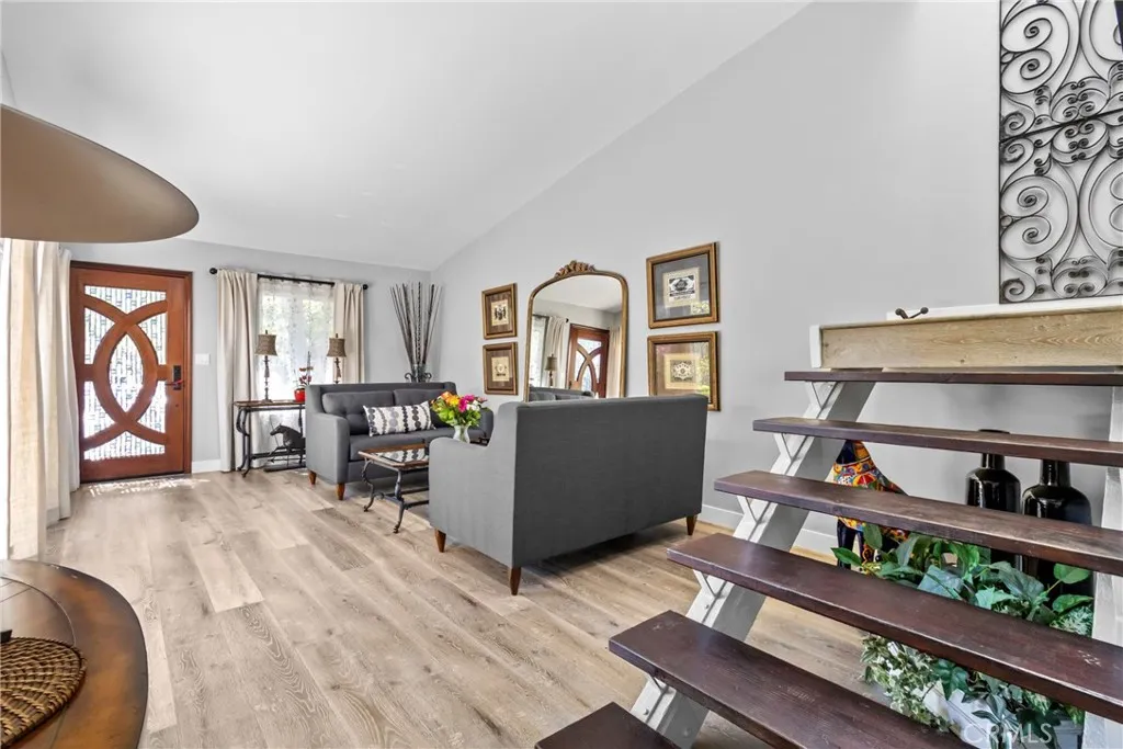 Welcome to this beautifully appointed Rockpointe townhome where thoughtful upgrades and refined finishes create a truly elevated living experience. The heart of the home is a stunning chefs kitchen featuring premium white cabinetry with soft-close functionality, elegant marble countertops and large kitchen island, sleek Frigidaire Gallery appliances, and a spacious pantry for optimal storage. Entertain effortlessly with a dedicated bar area complete with a wine refrigerator and seatingperfect for hosting intimate gatherings or unwinding at the end of the day. The home showcases wood laminate flooring throughout, offering both style and durability. Each bathroom has been tastefully enhanced with marble countertops, Kohler Memoirs fixtures, and showers featuring luxurious Hansgrohe multi-function showerheadsdelivering a spa-like experience. The living room is bathed in natural light, highlighted by soaring vaulted ceilings that create an open, airy ambiance. Step outside to your own private garden retreat, where lush landscaping includes two lemon trees, a lime tree, kumquat tree, manicured topiaries, and a thoughtfully designed outdoor entertaining areaideal for enjoying Southern Californias indoor-outdoor lifestyle. Recent upgrades include a newly installed air conditioning system, a newer water heater, enhanced attic insulation for improved energy efficiency, and a Flume Smart Home water monitoring system. The garage is equally impressive with epoxy flooring in a sophisticated granite finish and recessed lighting, and Tesla Electric vehicle charger, adding both function an